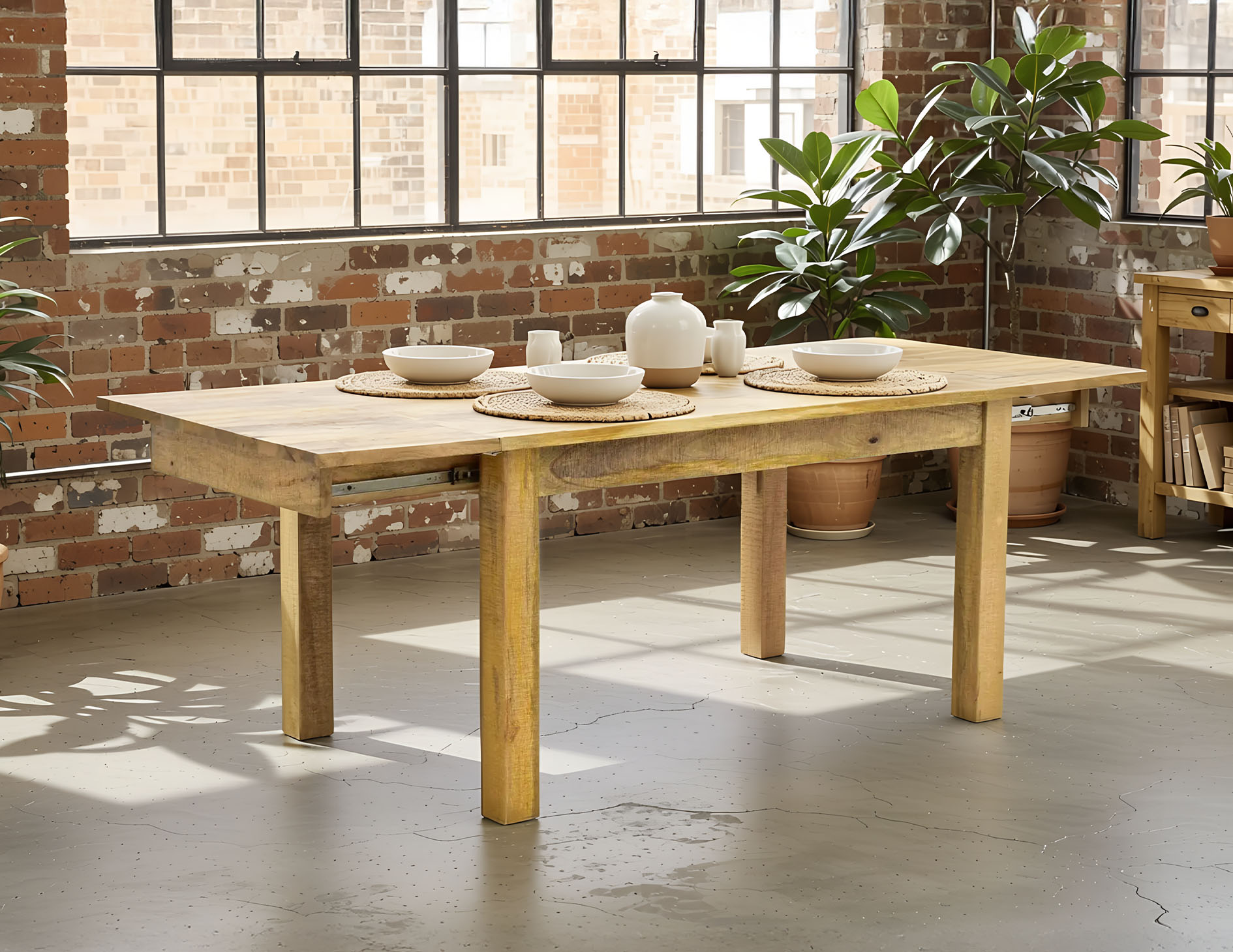 Stół kolonialny o długości 145 cm z funkcją rozłożenia do 225 cm. Mebel ręcznie wytworzony z litego drewna egzotycznego mangowca indyjskiego w naturalnym odcieniu.