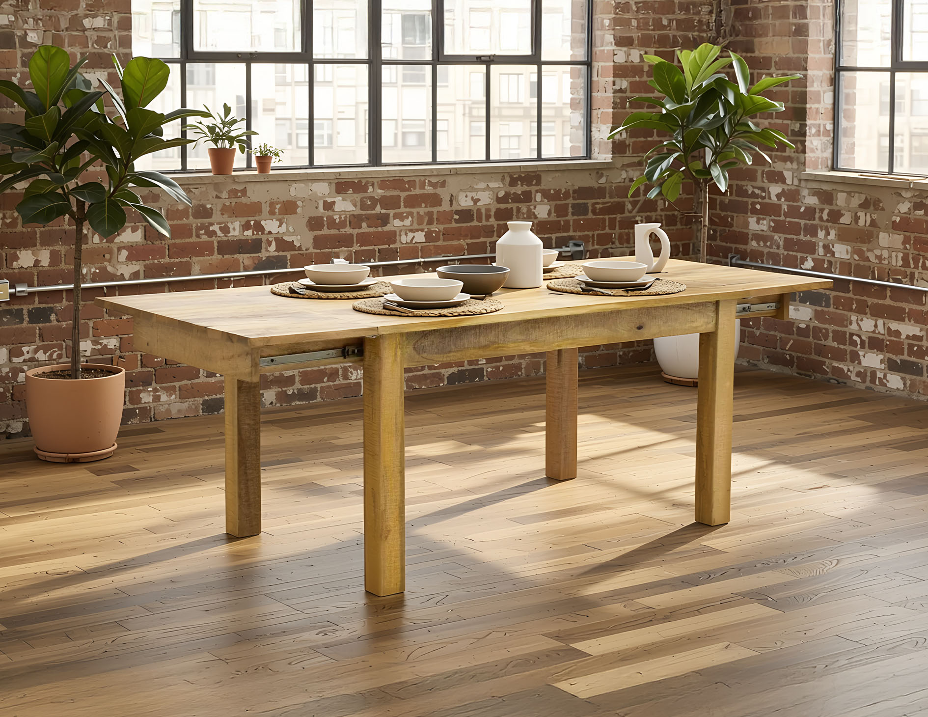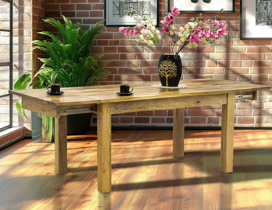 Stół kolonialny o długości 160 cm z funkcją rozłożenia do 240 cm. Mebel ręcznie wytworzony z litego drewna egzotycznego mangowca indyjskiego w naturalnym odcieniu.