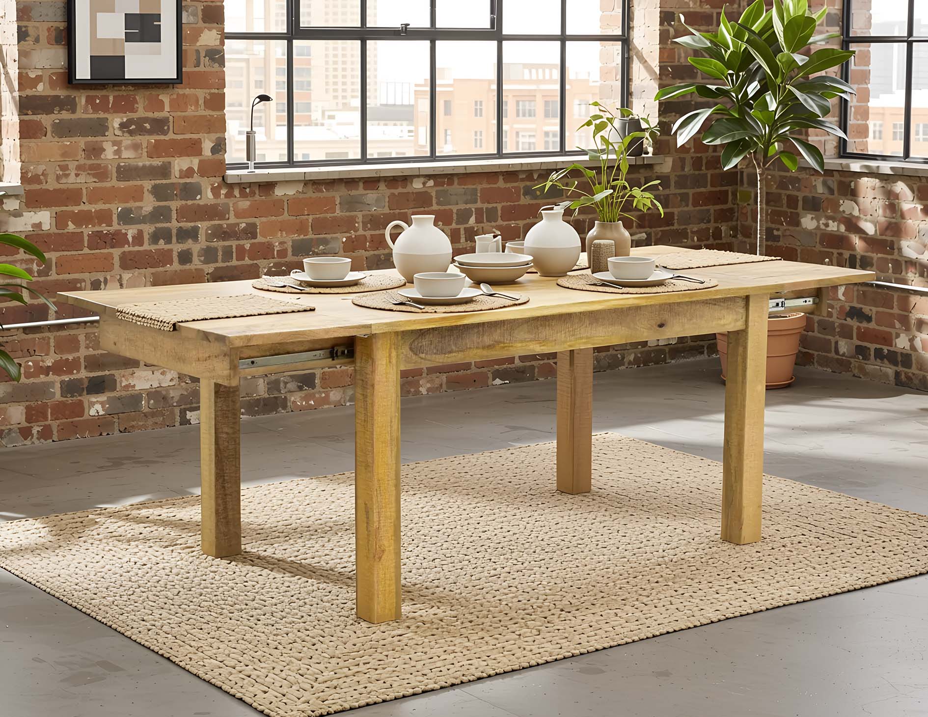 Stół kolonialny o długości 175 cm z funkcją rozłożenia do 255 cm. Mebel ręcznie wytworzony z litego drewna egzotycznego mangowca indyjskiego w naturalnym odcieniu.