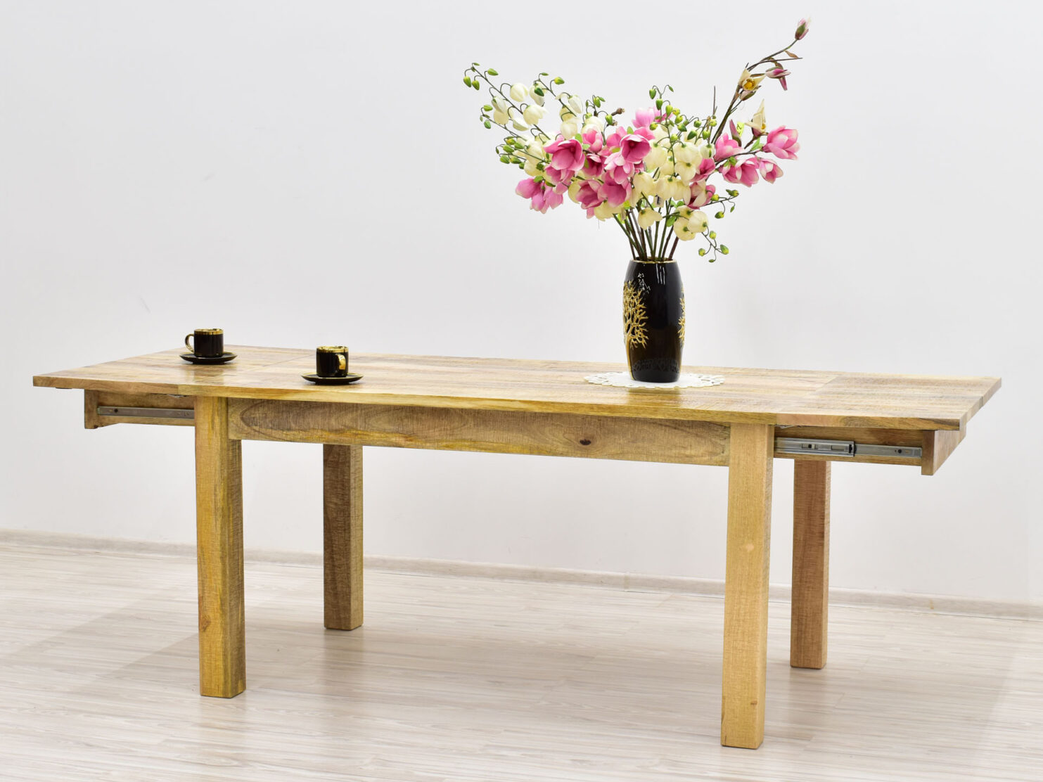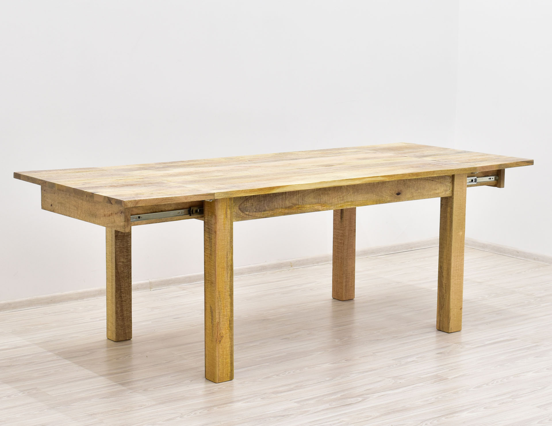 Stół kolonialny o długości 175 cm z funkcją rozłożenia do 255 cm. Mebel ręcznie wytworzony z litego drewna egzotycznego mangowca indyjskiego w naturalnym odcieniu.