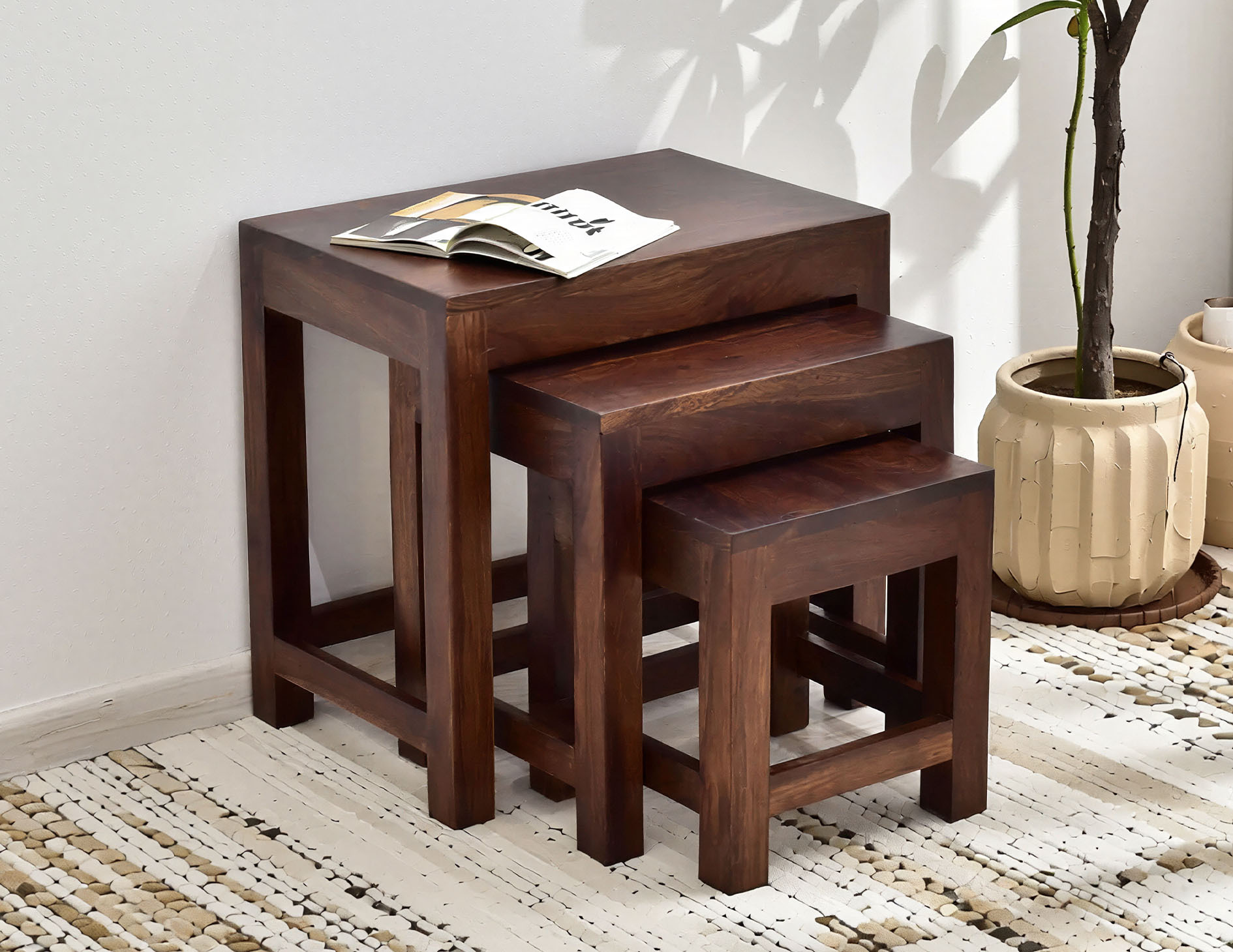 Komplet małych kolonialnych taboretów stworzonych z palisandru indyjskiego. W skład zestawu wchodzi najmniejszy w rozmiarze 26x26x29 cm, średni o rozmiarach 35x27x37 cm i największy z nich 45x30x45 cm. Wszystkie elementy zestawu są wykonane w 100% z litego drewna, wybarwionego na ciemny brąz. Stołki mają szerokie zastosowanie począwszy od małych stolików kawowych, po praktyczne kompaktowe taborety, które wsuwa się jeden pod drugi, dzięki czemu nie zabierają zbyt dużo miejsca. Jest to idealna propozycja dla tych, którzy dysponują ograniczoną przestrzenią, a nie chcą rezygnować ze swojego komfortu.