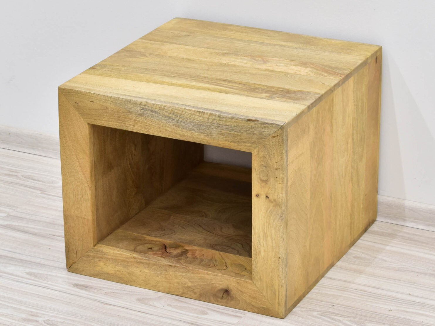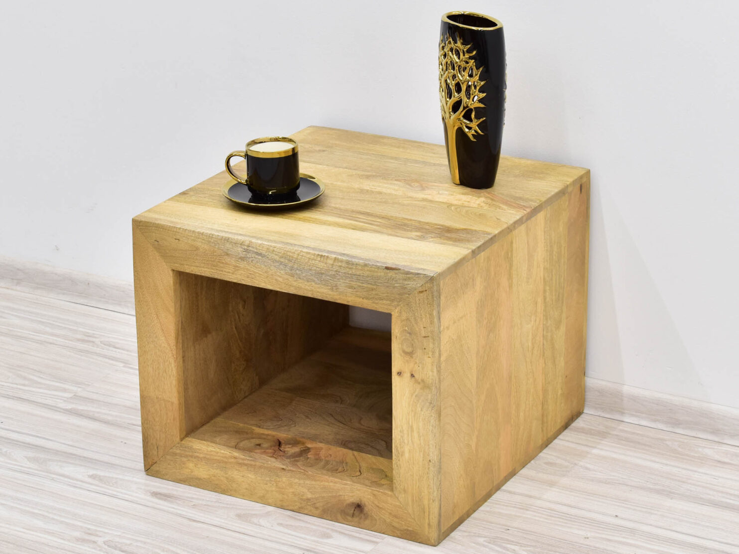 Indyjski stolik kolonialny z litego drewna mango. Mebel posiada nowoczesną linię i jasne wybarwienie, które pięknie eksponuje naturalne usłojenia drewna egzotycznego.