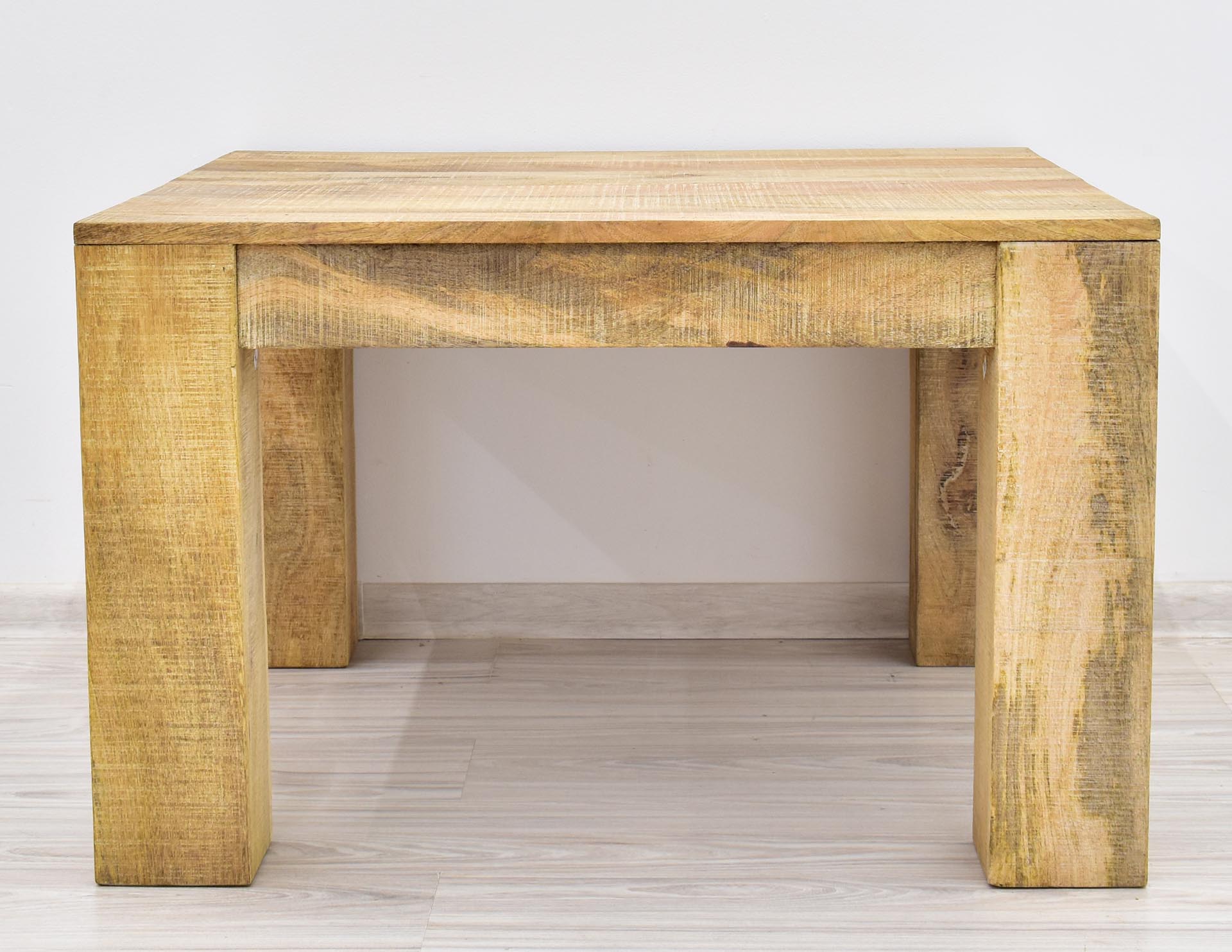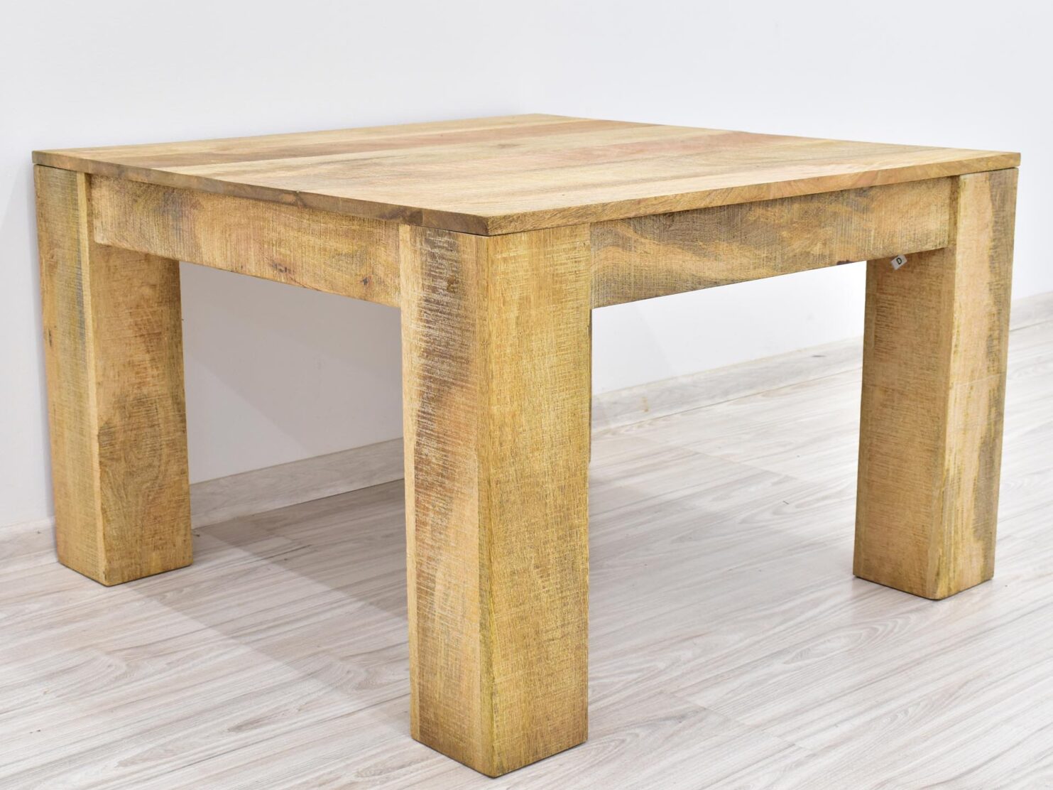 Mały stolik z kwadratowym blatem osadzonym na masywnych nogach. Stolik został wykonany w 100% z litego drewna mango, w swoim naturalnym kolorze.