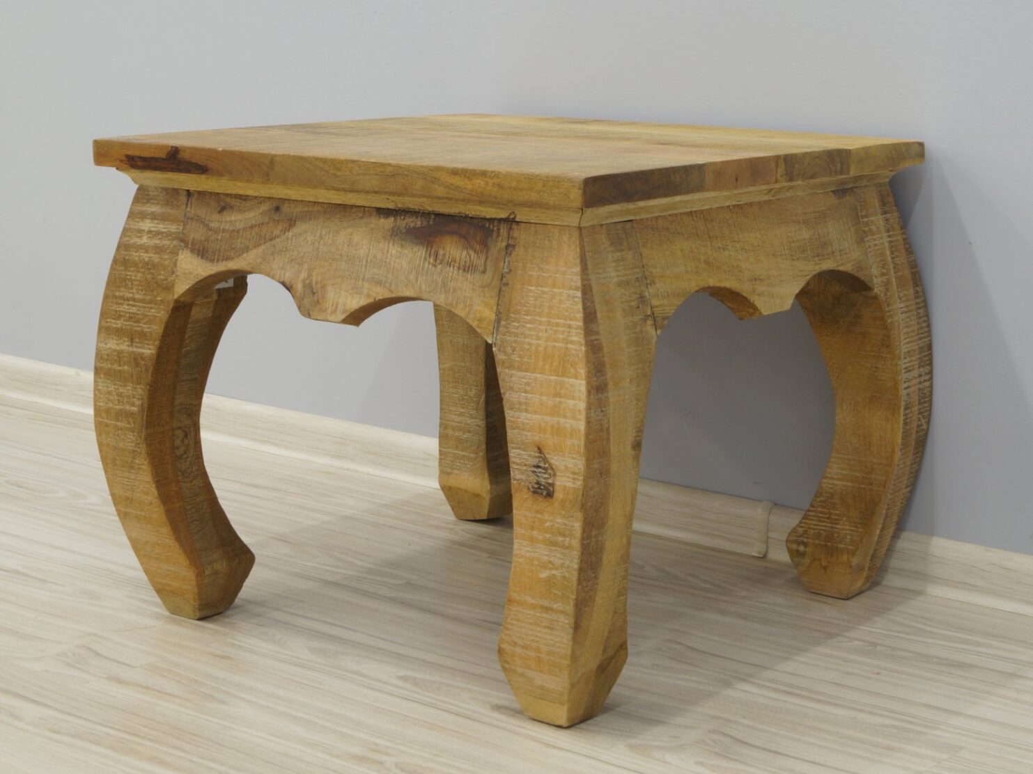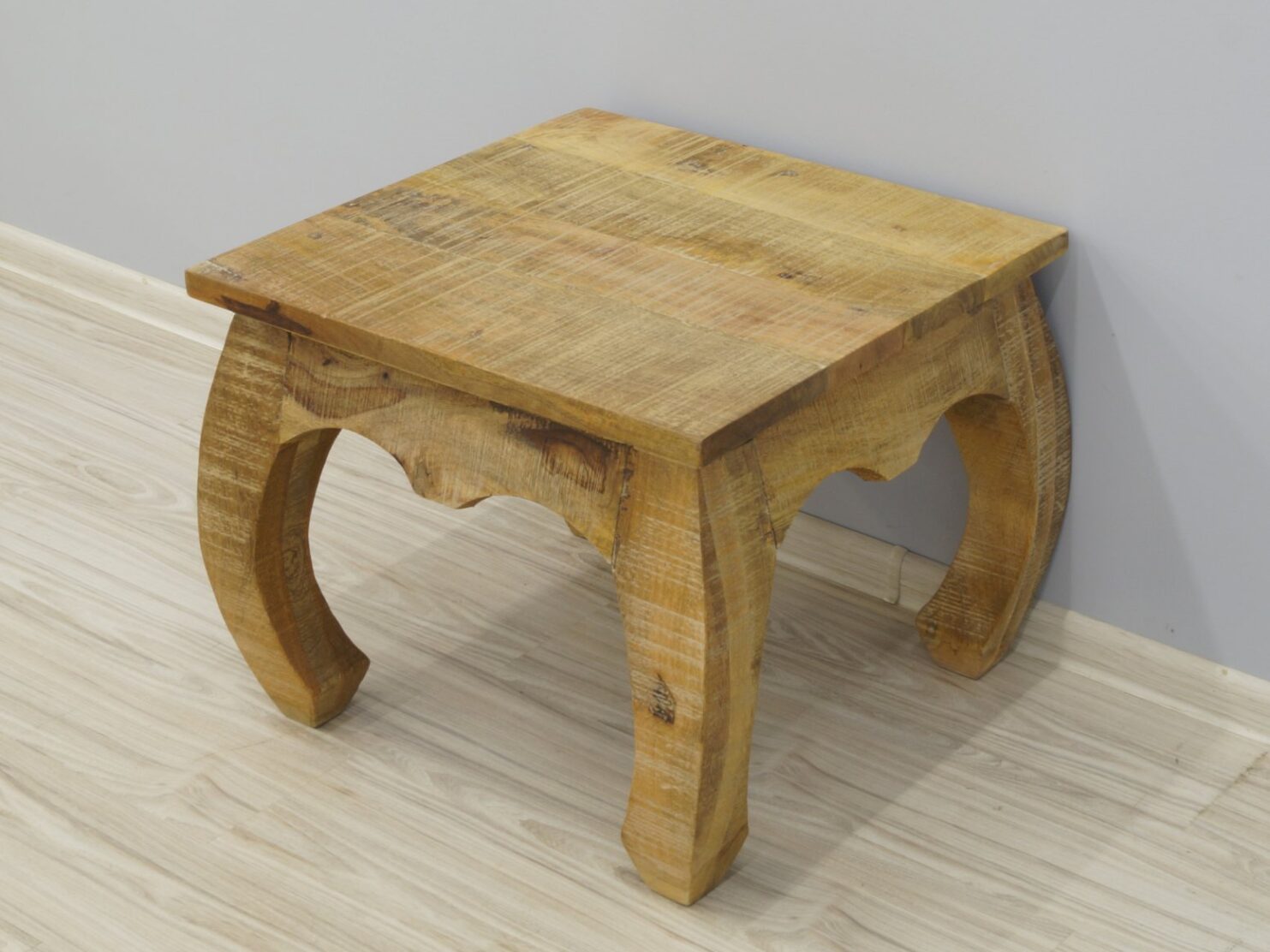 Kwadratowy, jasny stolik o boku 60cm, osadzony na giętych nogach w stylu opium, został stworzony przez indyjskich rzemieślników. Wykonany w 100% z litego drewna mango jest meblem bardzo charakterystycznym, pasującym do nowoczesnego, surowego stylu industrialnego. Wyrazista struktura i niejednorodne wybarwienie stwarza, że każdy egzemplarz jest wyjątkowy, niepowtarzalny.