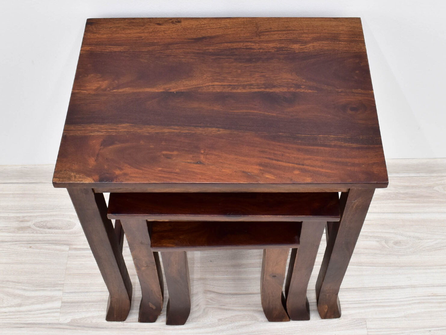 Stoliki kolonialne na wysokich nogach w trzech różnych rozmiarach. Stoliki te mogą służyć rozstawione po całej przestrzeni mieszkalnej lub wsunięte jeden pod drugi i okazjonalnie używane jako dodatkowe taborety. Największy ma rozmiary 52/37/58 cm a najmniejszy 27/28/38 cm, środkowy natomiast 39/32/48 cm. Zostały one wykonane w 100% z litego drewna palisandru indyjskiego wybarwionego na kolor ciemny brąz. Posiadają stylowe gięte nogi, które nadają uroku i przełamują prostotę mebli. Doskonale wtopią się w aranżacje w stylu klasycznym czy bardziej ozdobnym stylu Vintage.