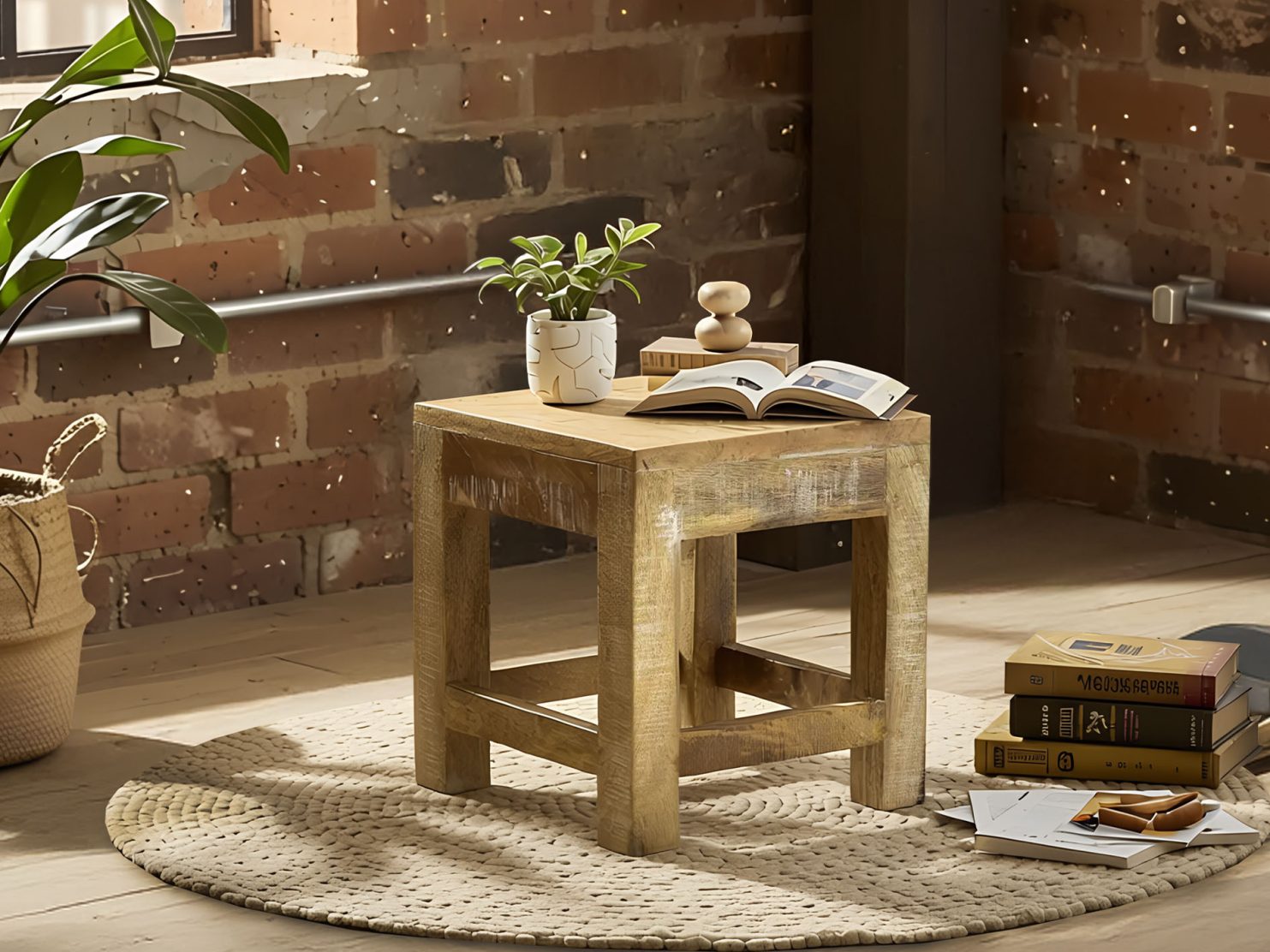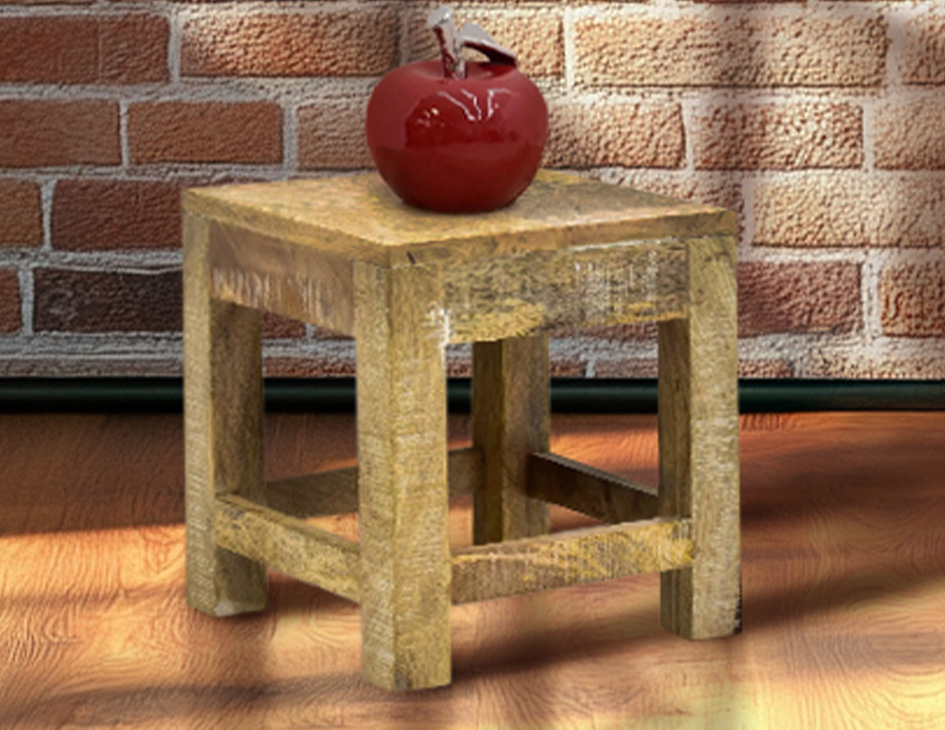 Małych rozmiarów stoliczek kawowy wykonany z litego drewna palisandru indyjskiego. Jest wysoki na 38cm i posiada wygięte nogi i mały blat. W razie potrzeby można jego zaadoptować do funkcji taboretu, który zajmuje bardzo mało miejsca.