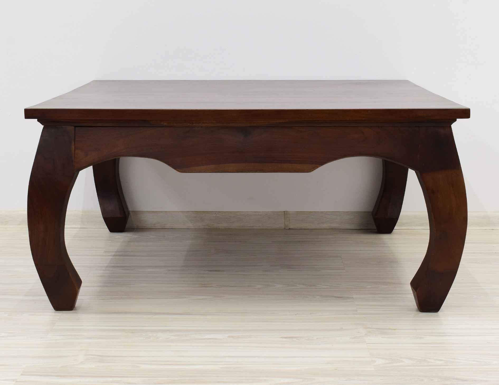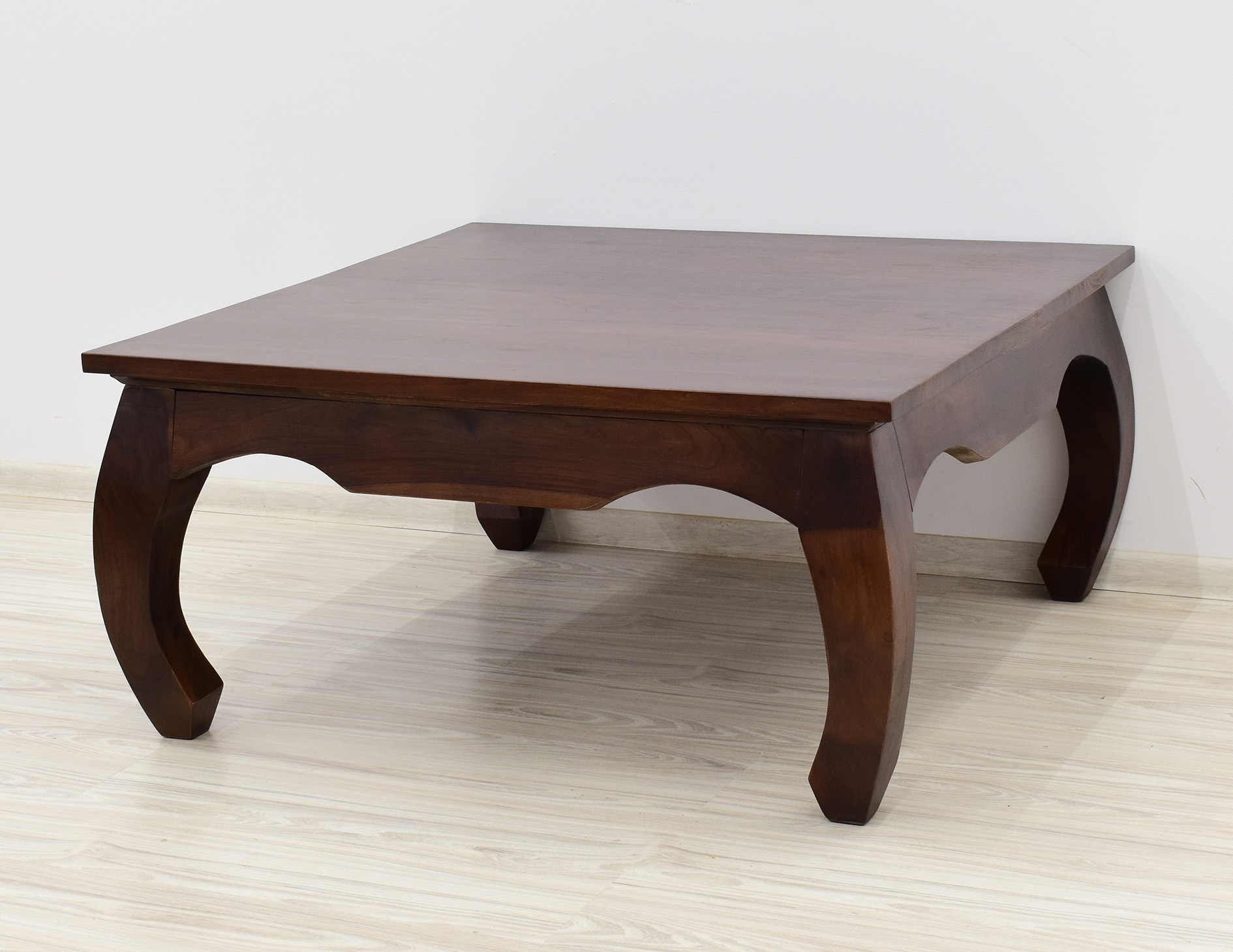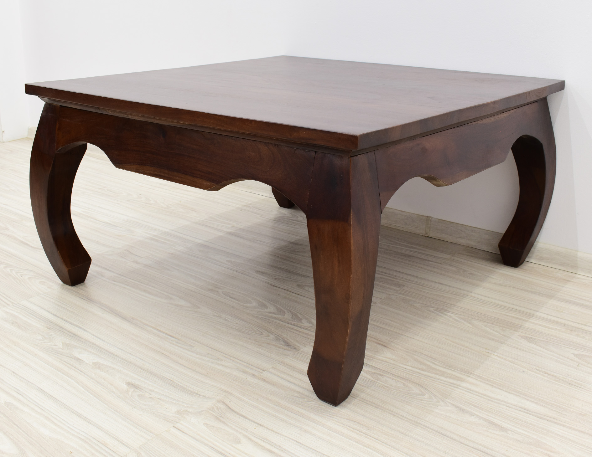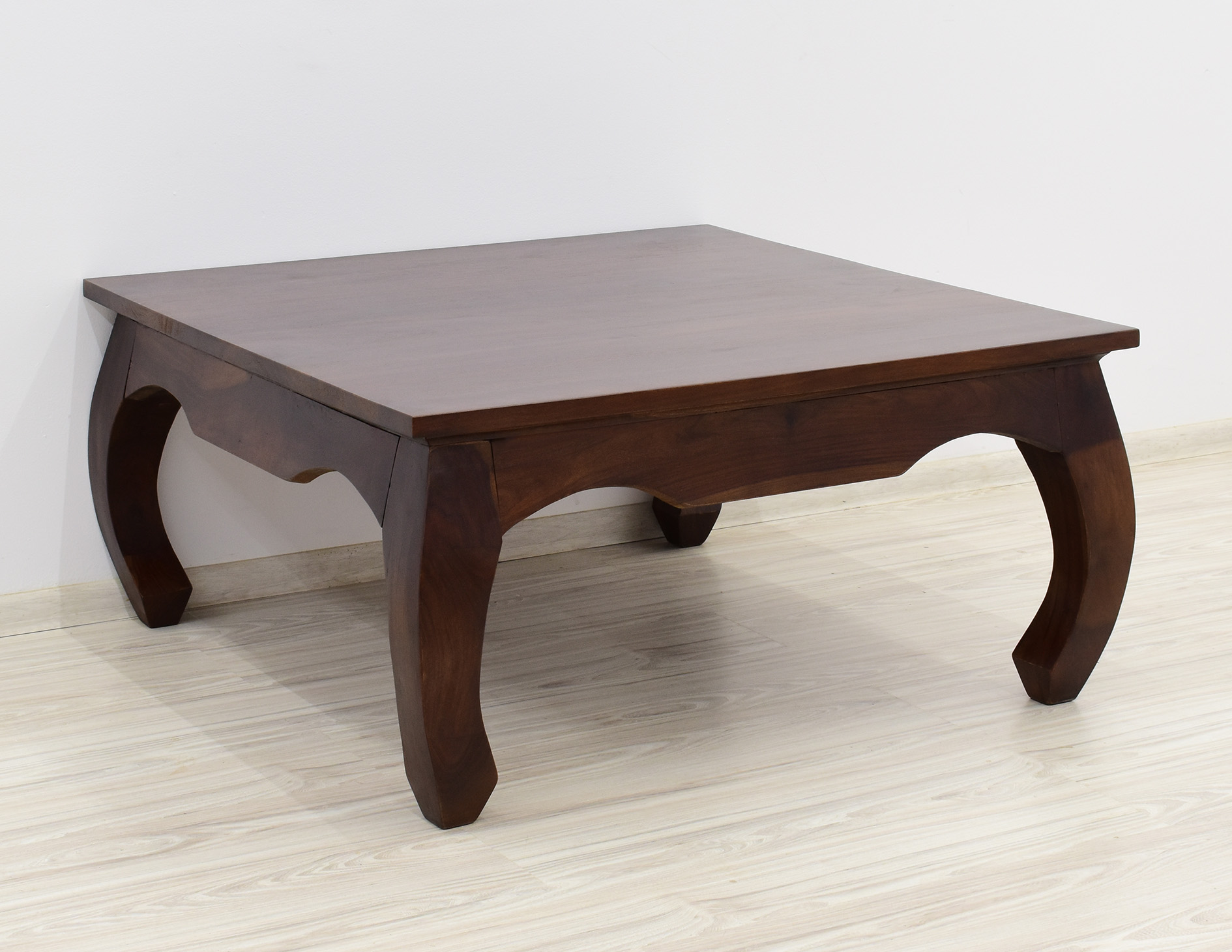 Kwadratowy stolik o boku 100cm idealny do każdego klasycznie zaaranżowanego salonu. Jest wybarwiony w pięknym, ciemnym odcieniu brązu, który podkreśla ciekawe usłojenie naturalnego drewna palisandru indyjskiego. Został wykonany w 100% z litego drewna, posiada unikatowe gięte nogi w styli tzw. opium, co staje się jego niewątpliwym atutem estetycznym.