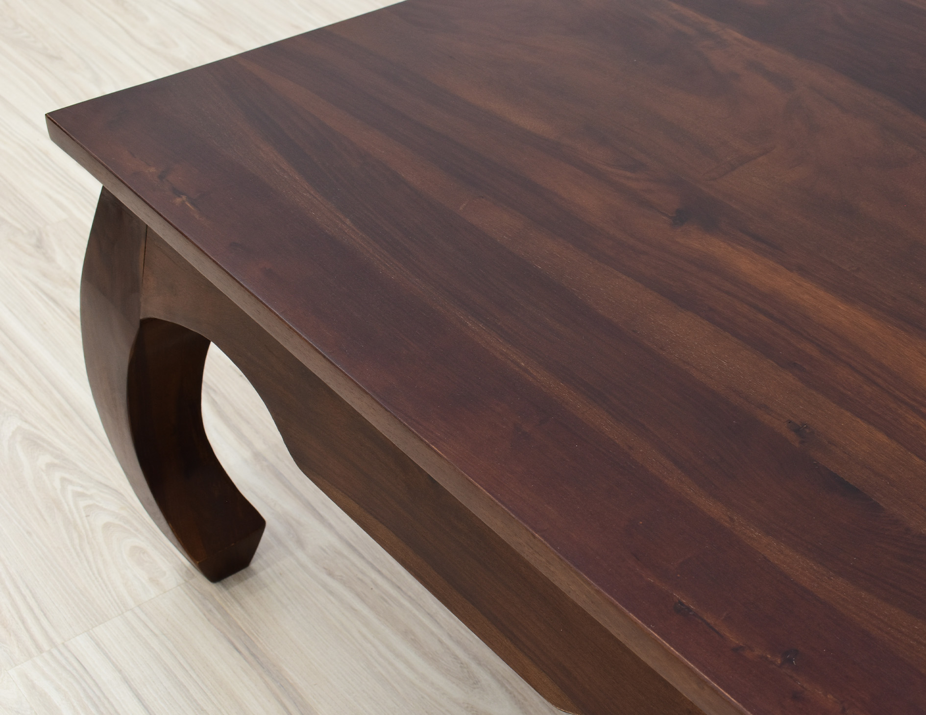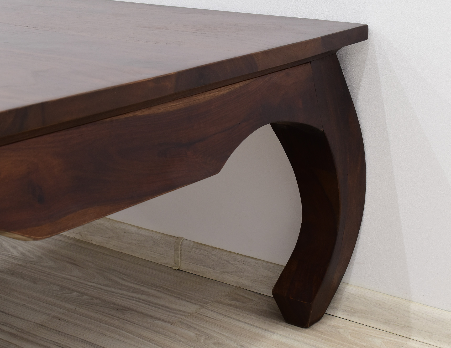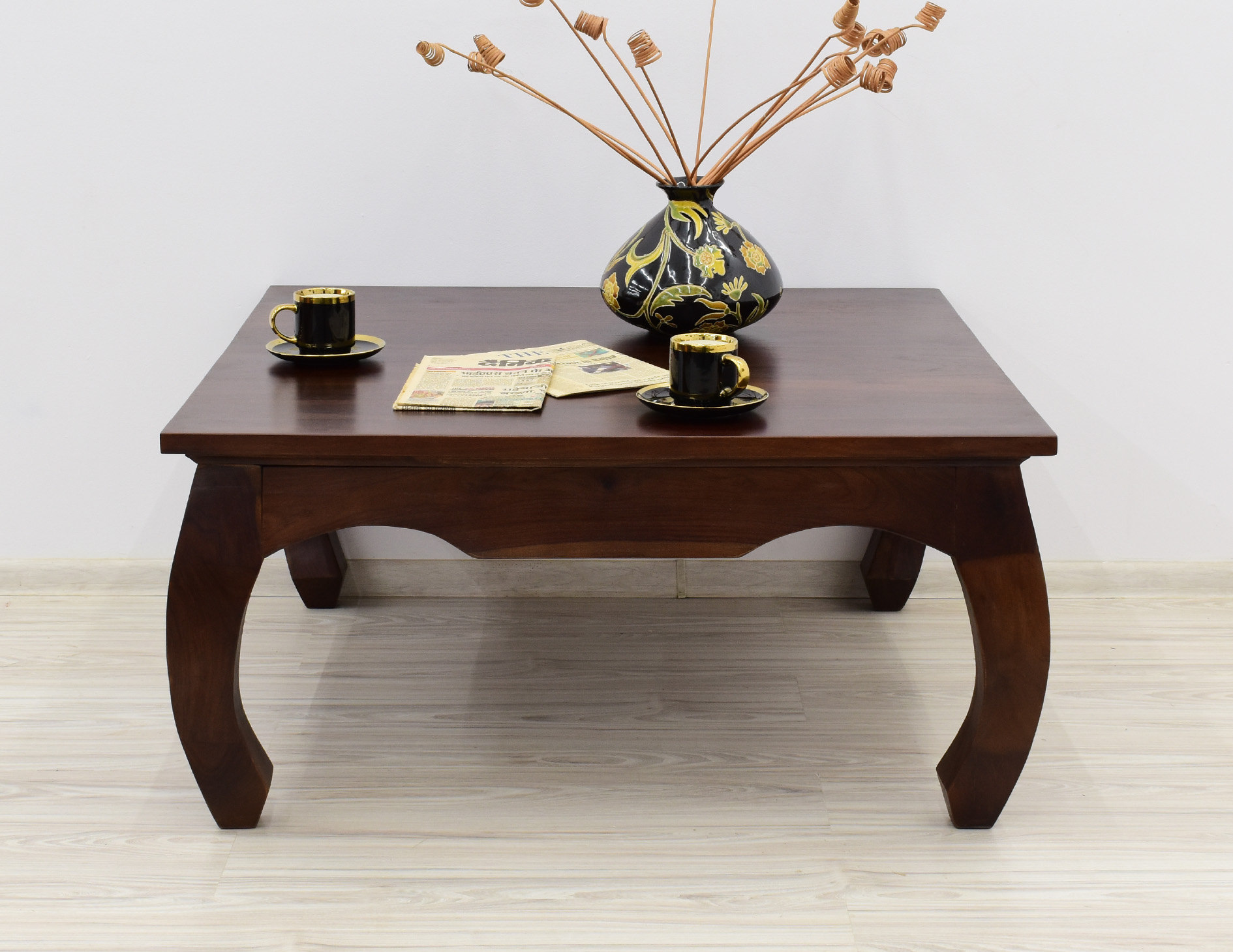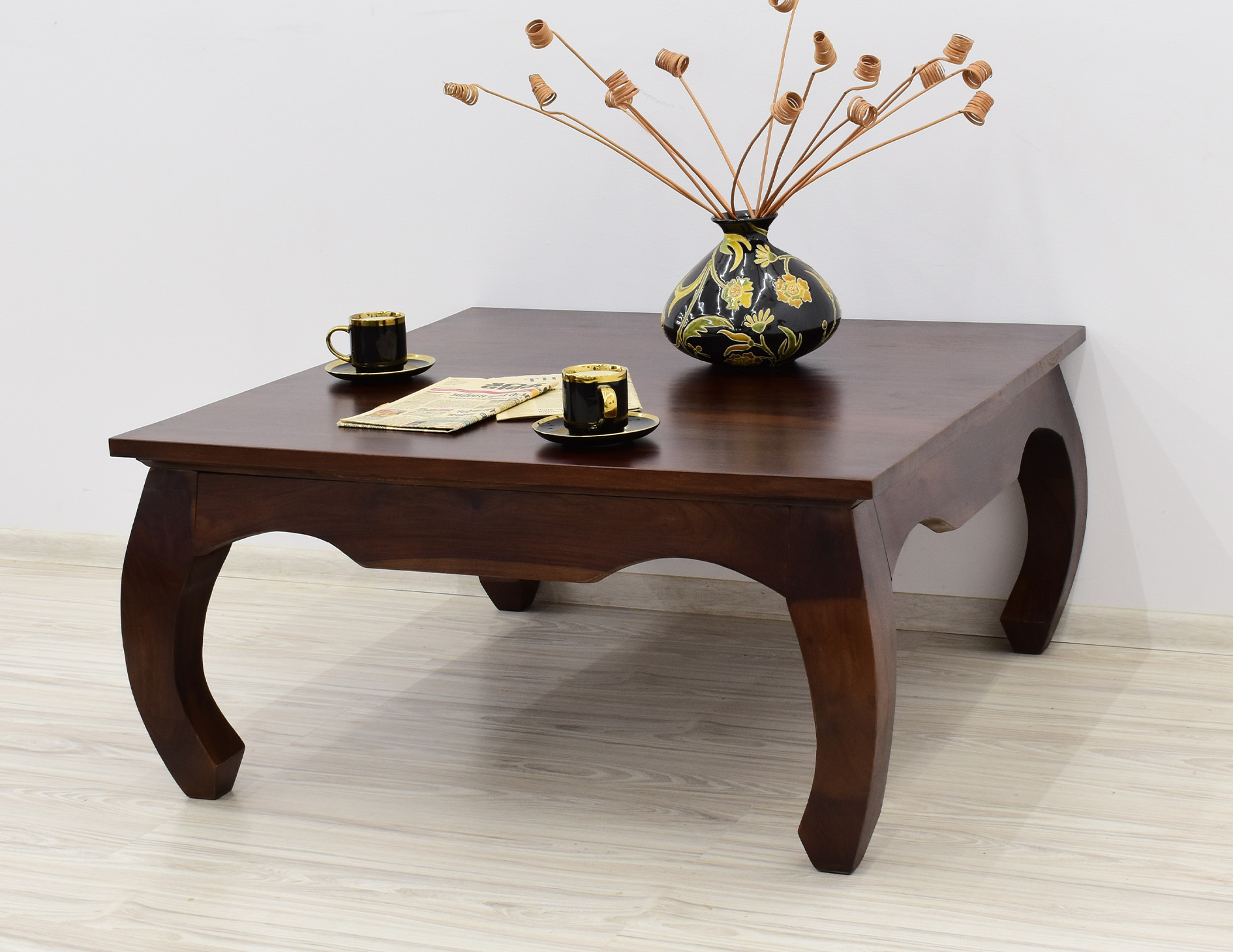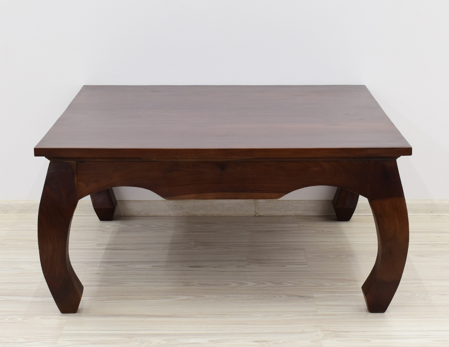 Kwadratowy stolik o boku 100cm idealny do każdego klasycznie zaaranżowanego salonu. Jest wybarwiony w pięknym, ciemnym odcieniu brązu, który podkreśla ciekawe usłojenie naturalnego drewna palisandru indyjskiego. Został wykonany w 100% z litego drewna, posiada unikatowe gięte nogi w styli tzw. opium, co staje się jego niewątpliwym atutem estetycznym.