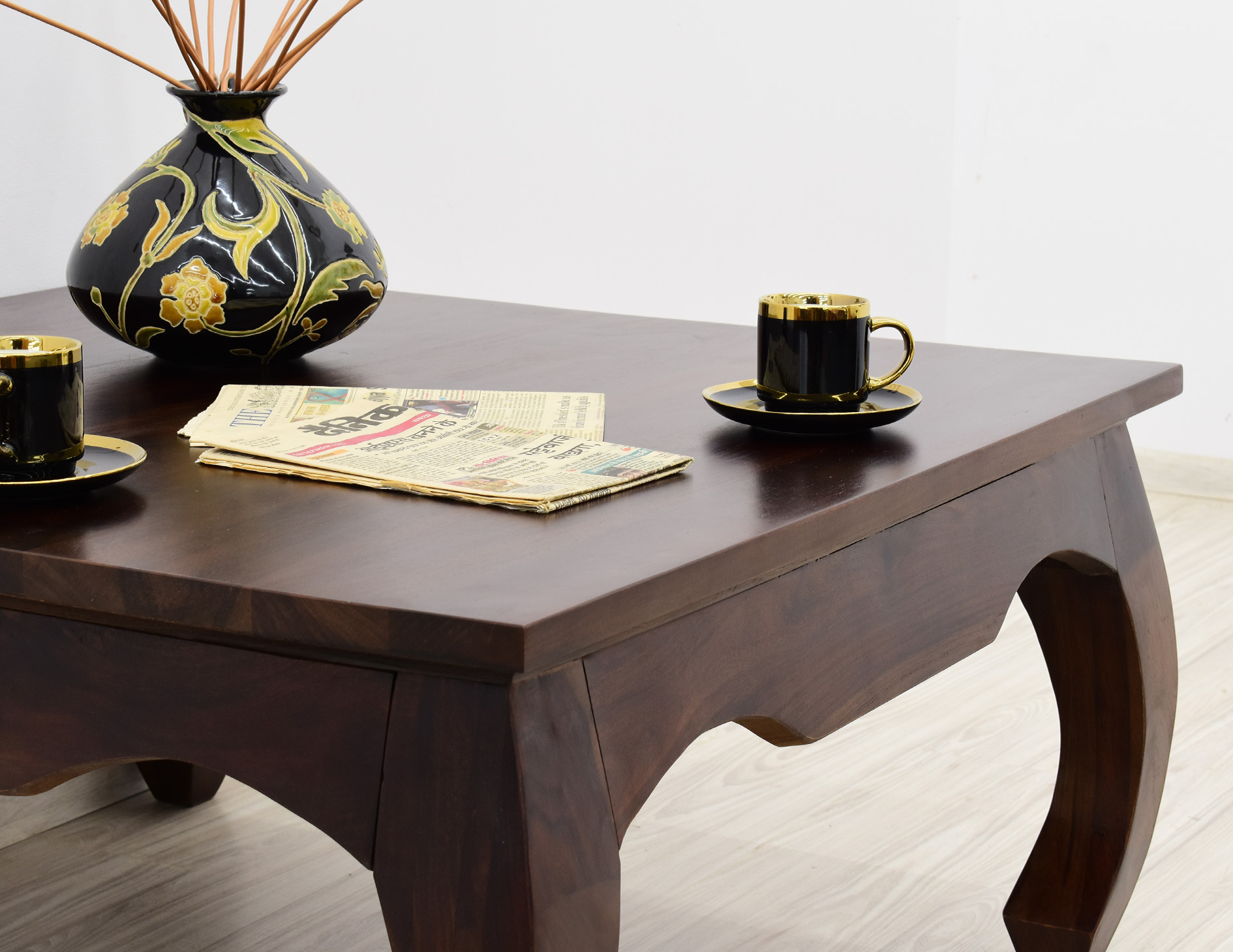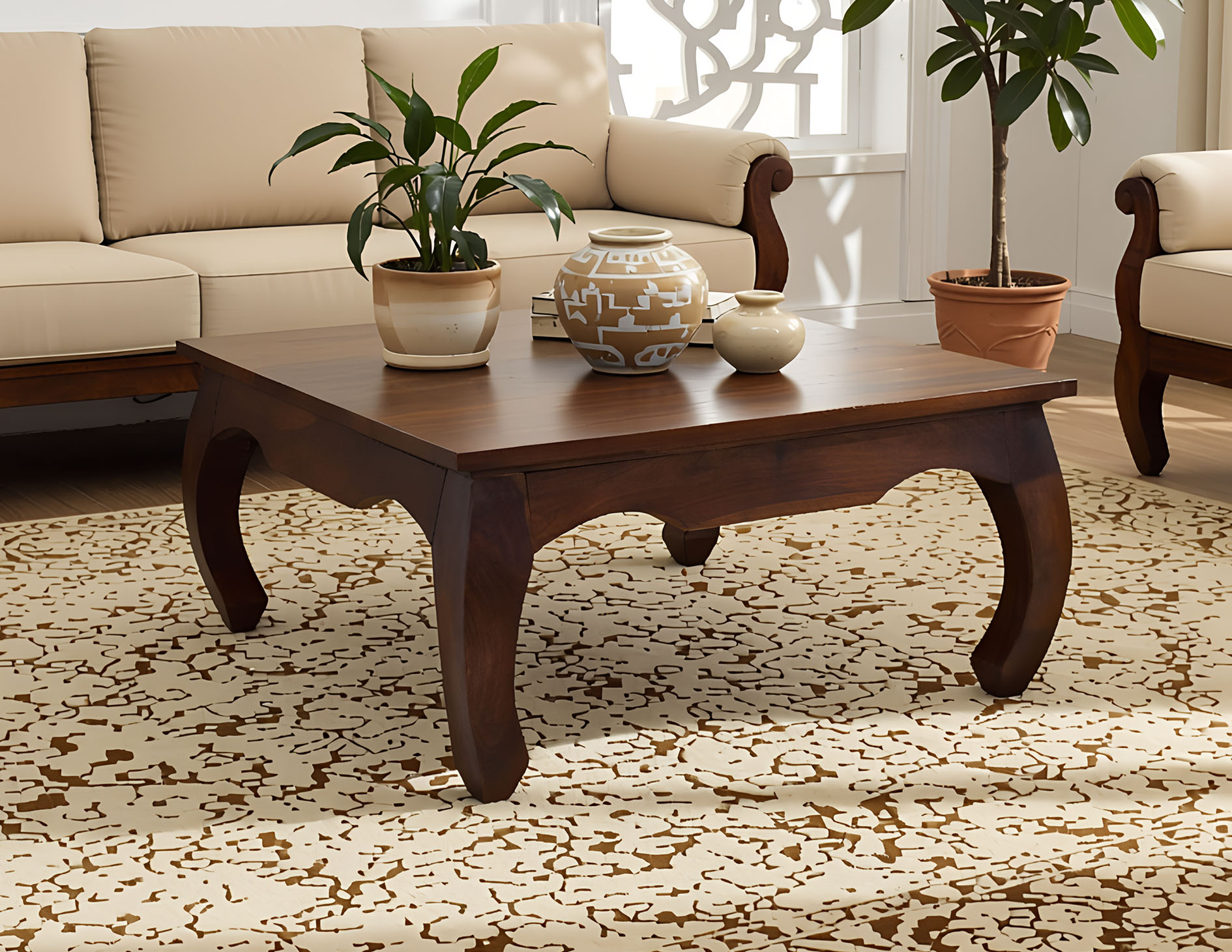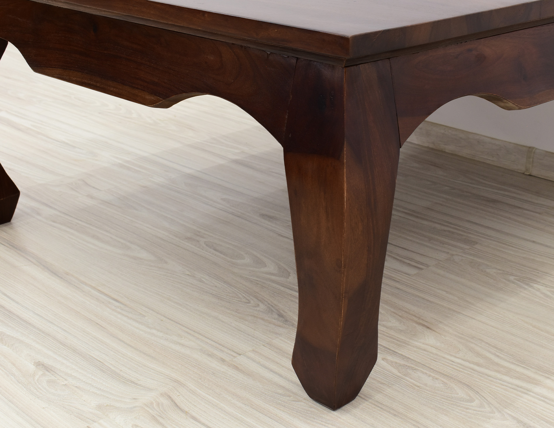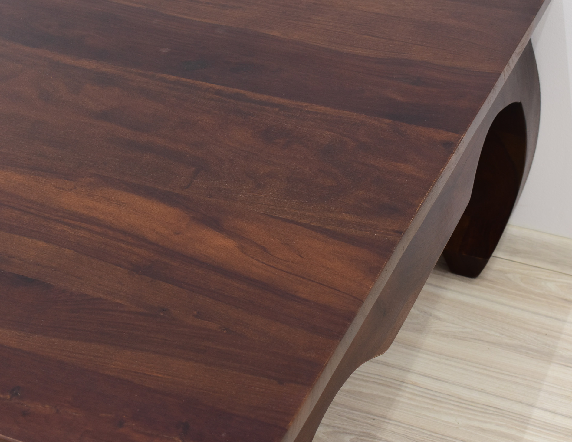 Kwadratowy stolik o boku 100cm idealny do każdego klasycznie zaaranżowanego salonu. Jest wybarwiony w pięknym, ciemnym odcieniu brązu, który podkreśla ciekawe usłojenie naturalnego drewna palisandru indyjskiego. Został wykonany w 100% z litego drewna, posiada unikatowe gięte nogi w styli tzw. opium, co staje się jego niewątpliwym atutem estetycznym.