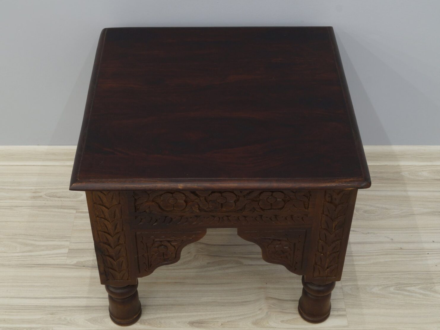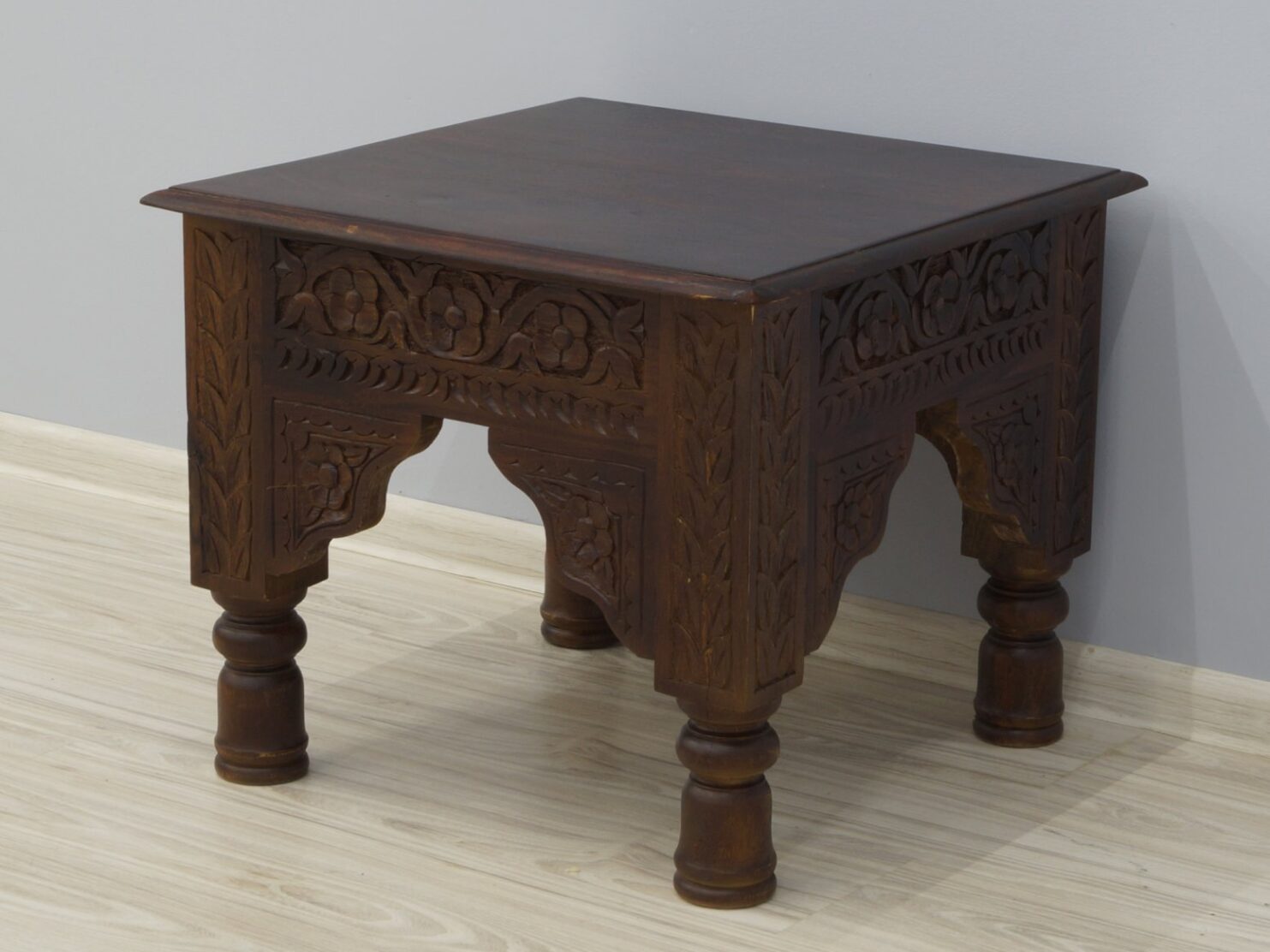 Niewielki, kwadratowy stolik o boku 58cm stworzony został przez doświadczonych rzemieślników indyjskich. Wykonany został w 100% z litego, szlachetnego, niezwykle twardego drewna palisandru indyjskiego. Ów mebel jest okazem bardzo charakterystycznym, ponieważ dokonano na nim wielu zabiegów dekoracyjnych na stosunkowo małej powierzchni. Posiada bogato rzeźbione, frezowane boczne ścianki, do których umocowano krótkie, toczone nóżki. Tak dekoracyjny stolik kawowy sprawdzi się w aranżacjach kolonialnych lub eklektycznych, gdzie będzie elementem łamiącym konsekwencję w zamierzonym stylu.