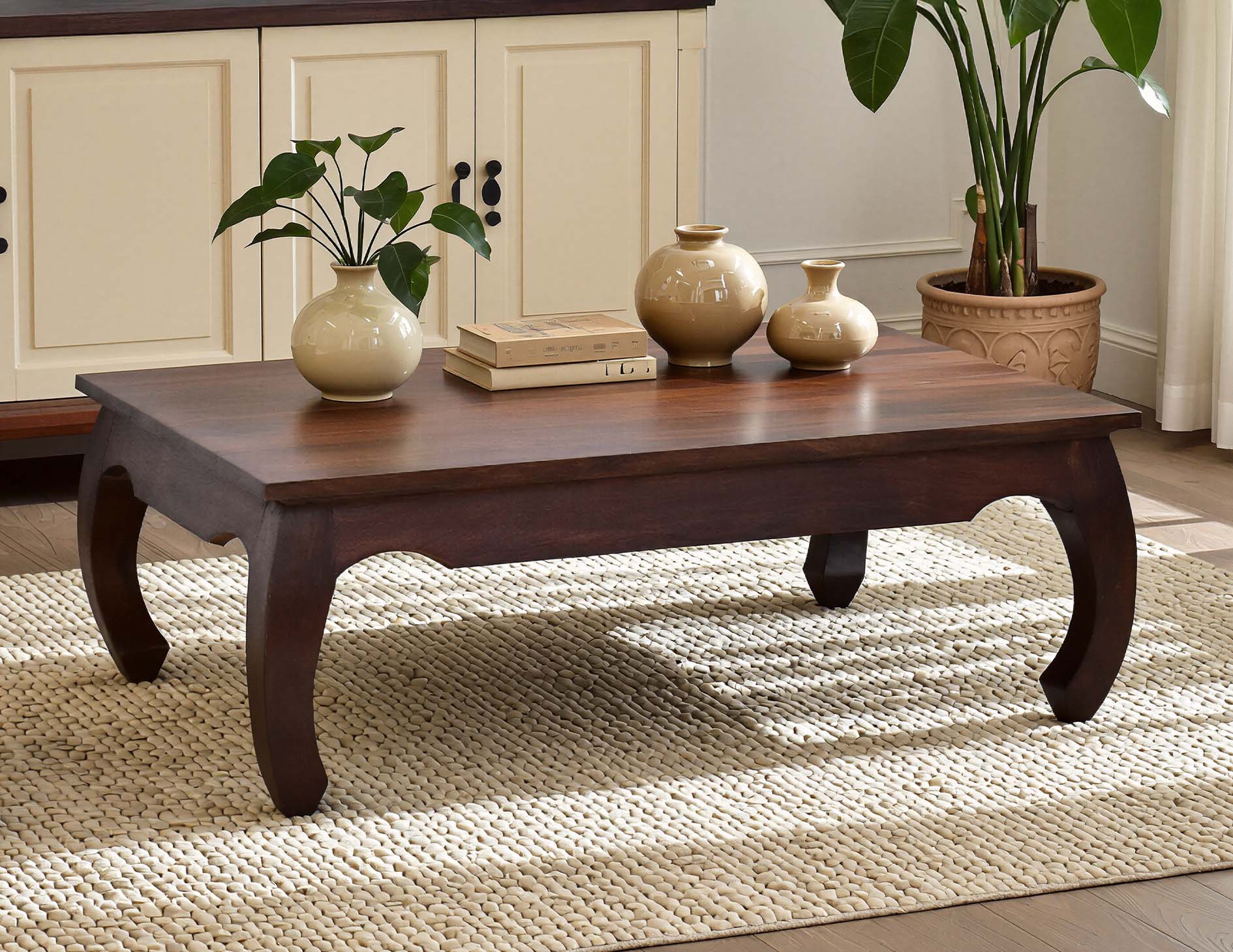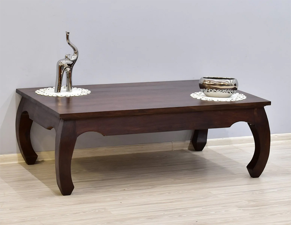 Stolik kawowy kolonialny stworzony w Indiach z niezwykle trwałego ciemnego drewna palisandru indyjskiego. Jest to w 100% lite drewno, którego piękne słoje doskonale się prezentują na blacie stolika oraz jego stylowych, wygiętych nogach. Ława została wybarwiona na odcień ciemnego brązu. Będzie egzotyczną ozdobą każdego aneksu wypoczynkowego urządzonego nie tylko w klasycznym stylu. Dodając ten stolik do swojego wnętrza, wzbogacisz je nie tylko o praktyczny element, ale także o piękno i wyjątkowość ręcznie wykonanego mebla. Stolik kawowy ciemny brąz z litego drewna to nie tylko mebel – to kawałek historii i tradycji Indii niosące piękno do Twojego domu.