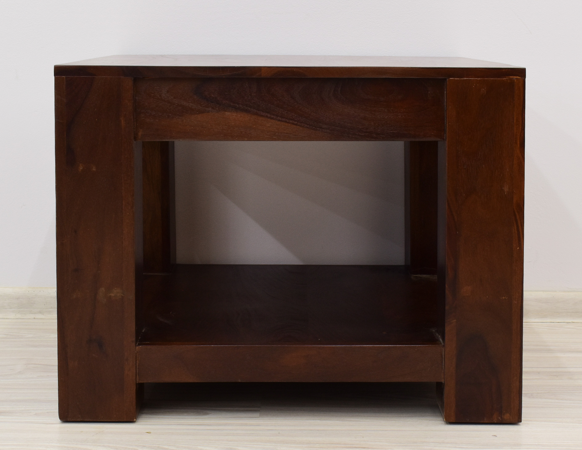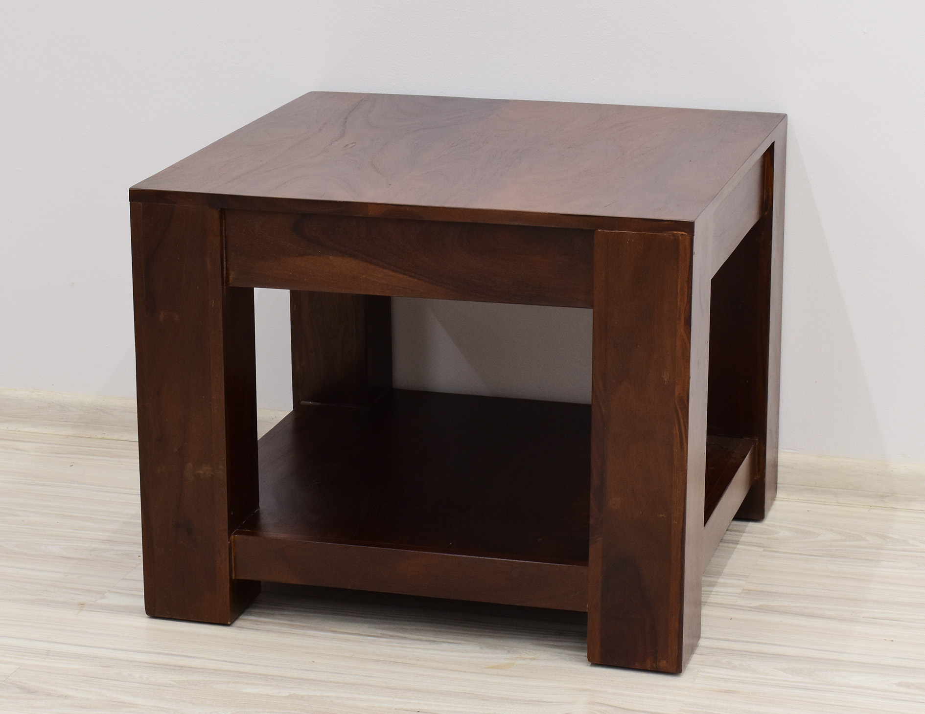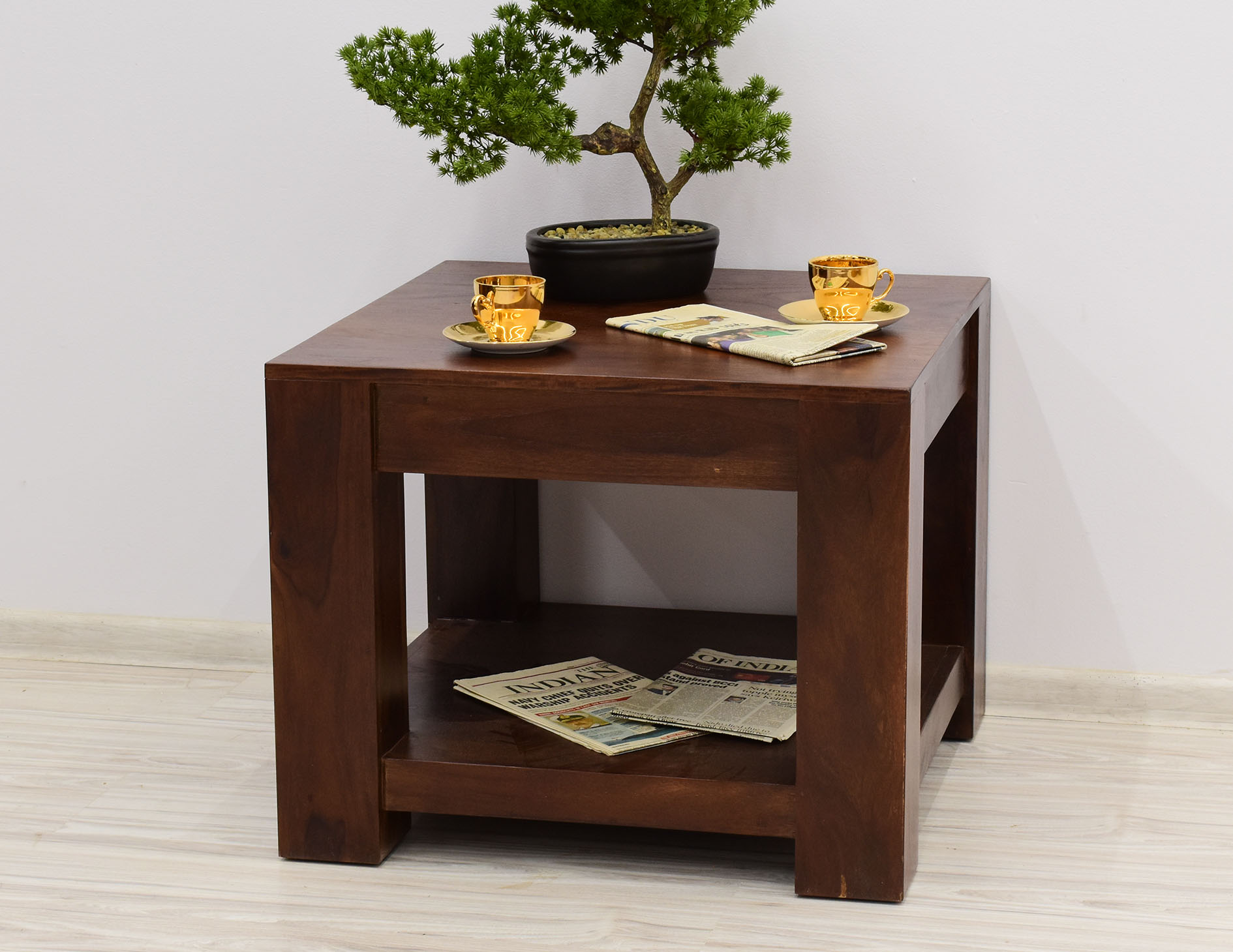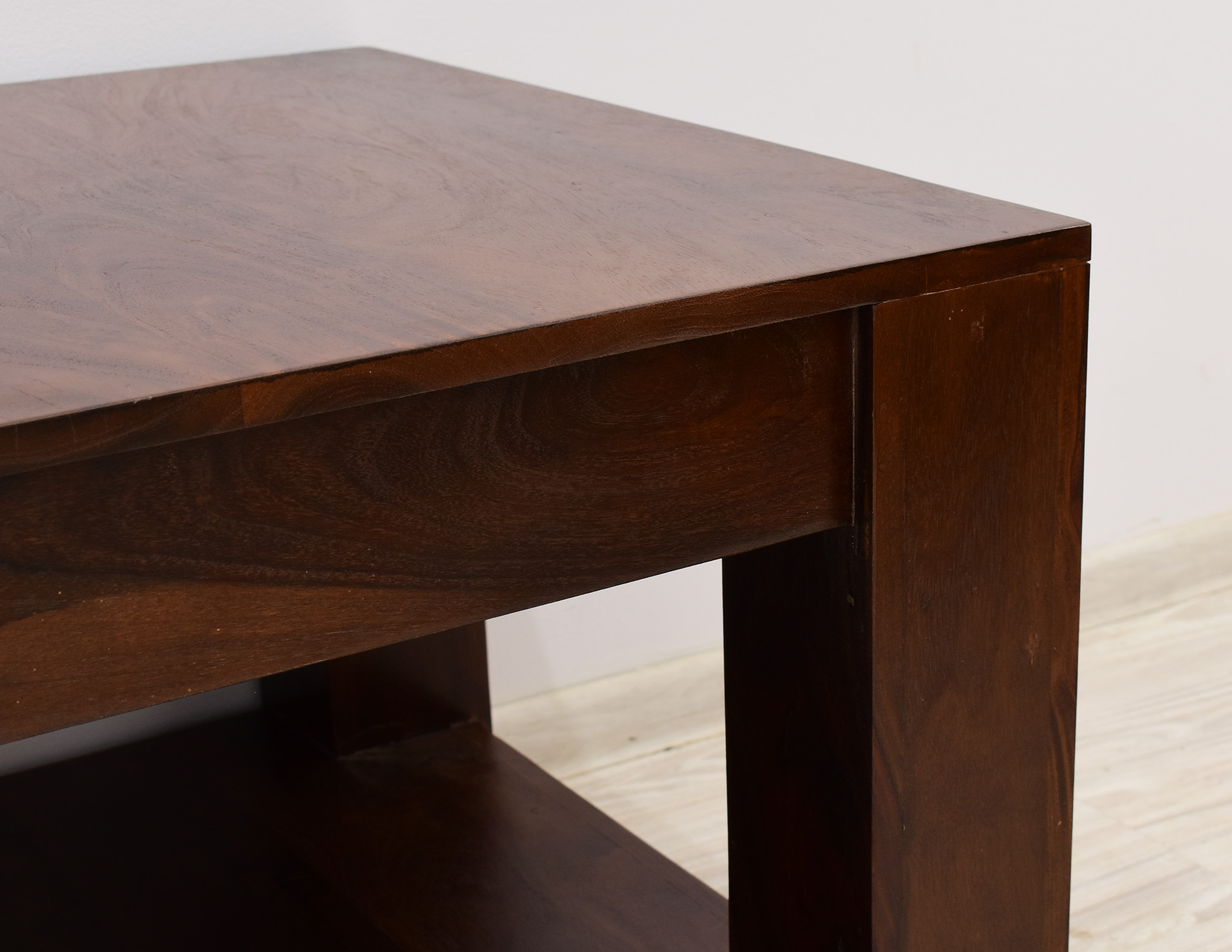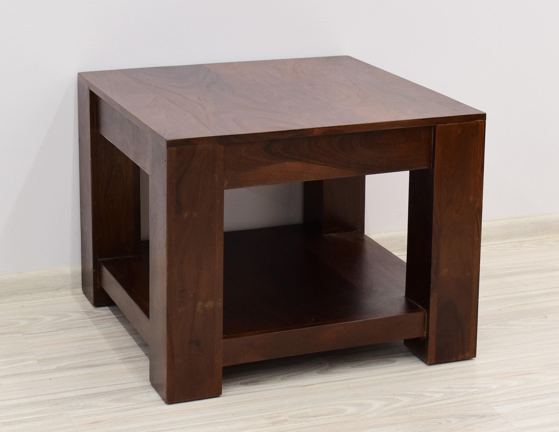 Stolik kolonialny o niewielkim kwadratowym blacie został wykonany w 100% z litego drewna palisandru indyjskiego. Taki podręczny mebel znajdzie swoje miejsce w każdym, nawet małych rozmiarów, salonie. Jego prosta, masywna konstrukcja z półeczką na dole, wpisze się nie tylko w nowoczesne wnętrze.