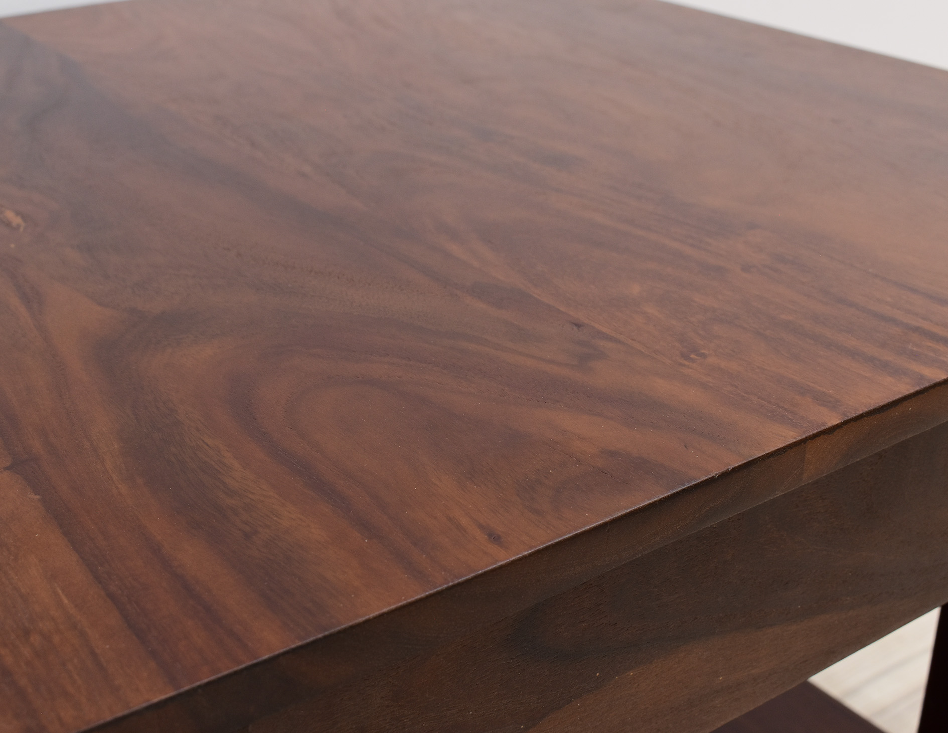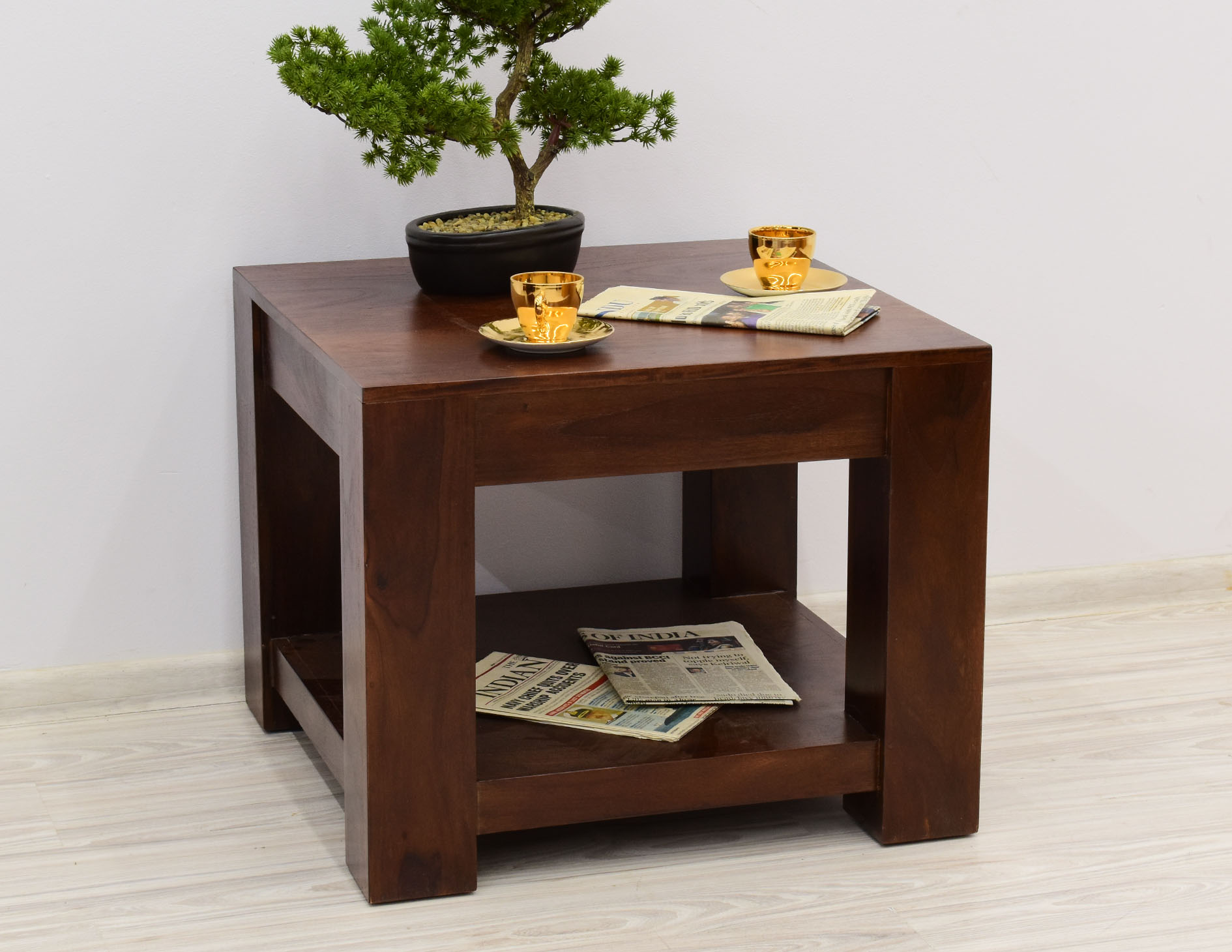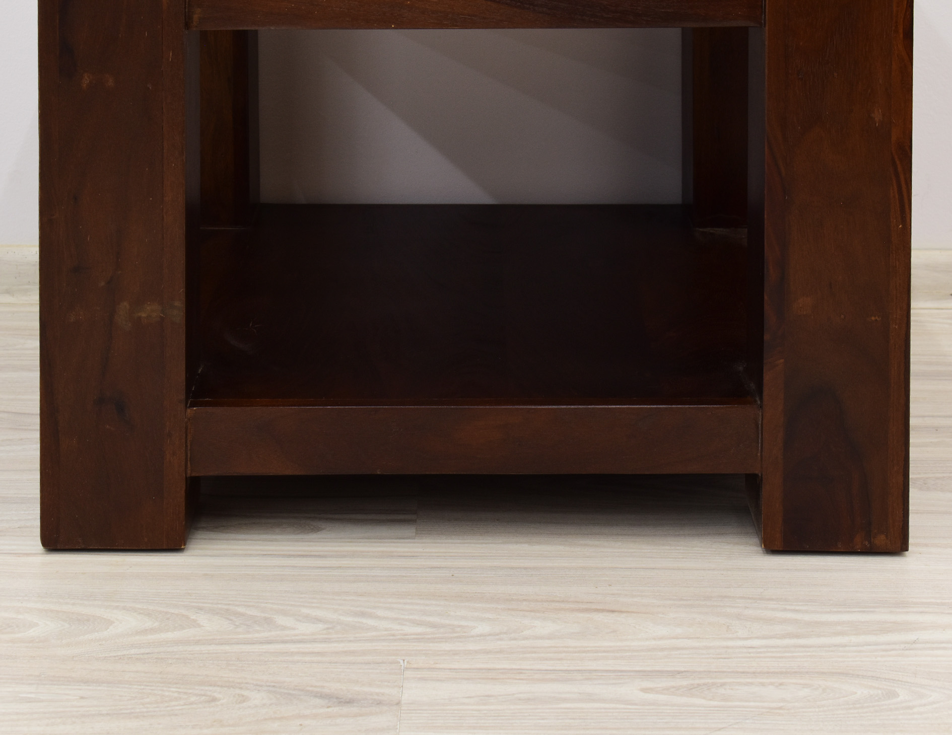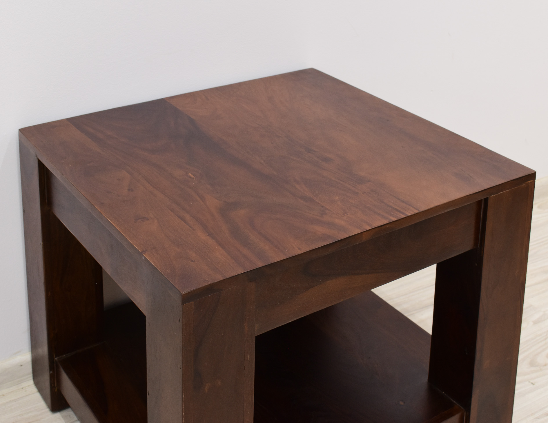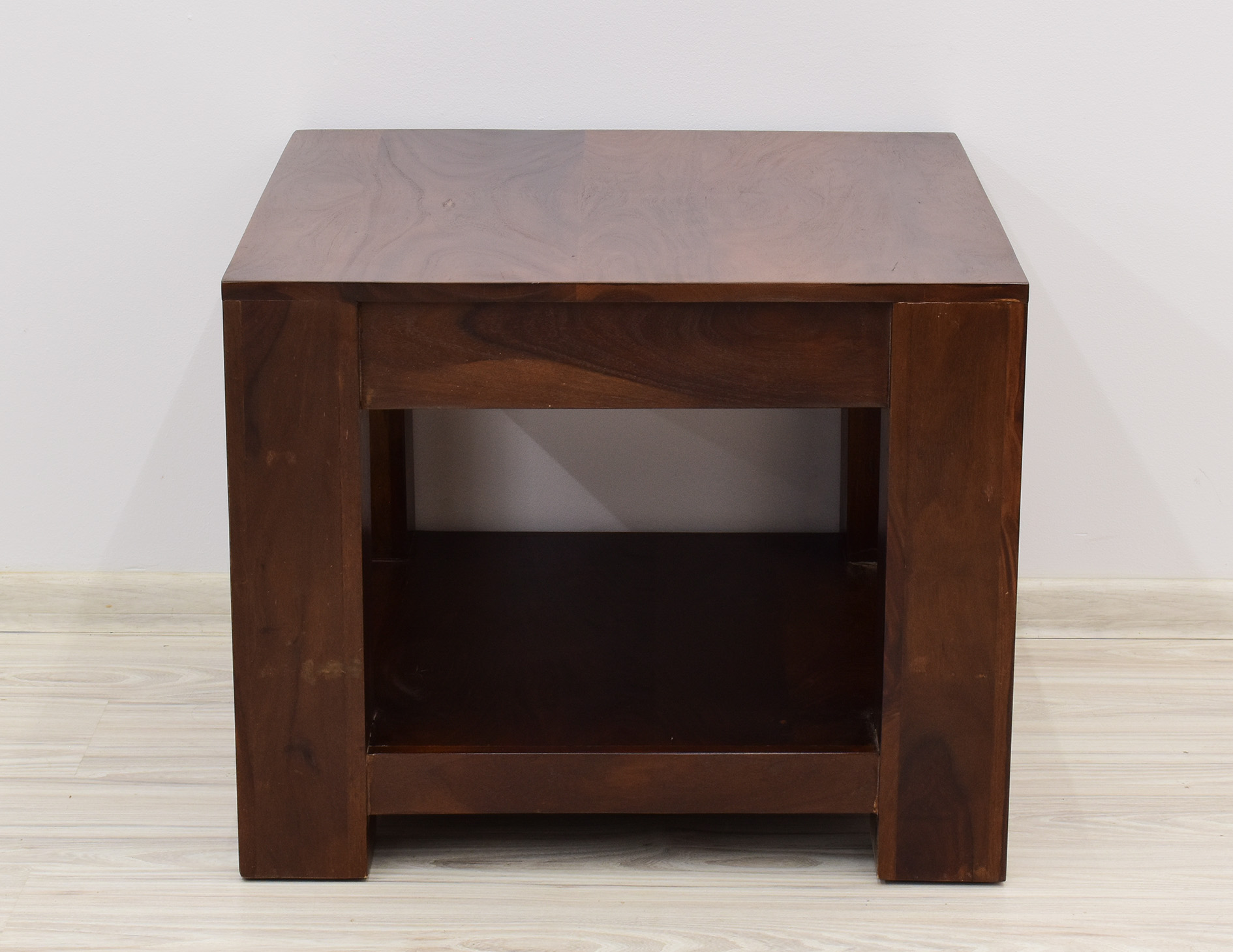 Stolik kolonialny o niewielkim kwadratowym blacie został wykonany w 100% z litego drewna palisandru indyjskiego. Taki podręczny mebel znajdzie swoje miejsce w każdym, nawet małych rozmiarów, salonie. Jego prosta, masywna konstrukcja z półeczką na dole, wpisze się nie tylko w nowoczesne wnętrze.