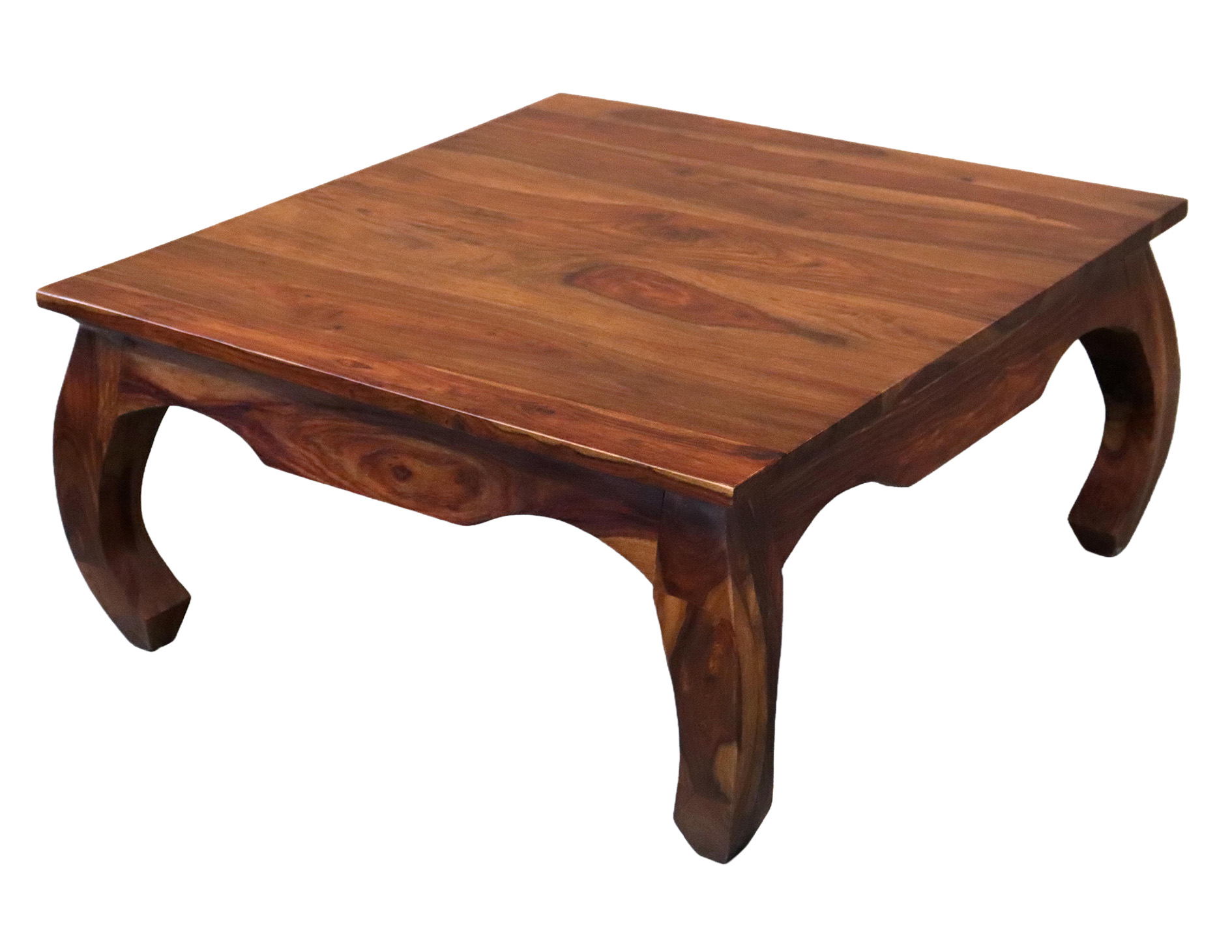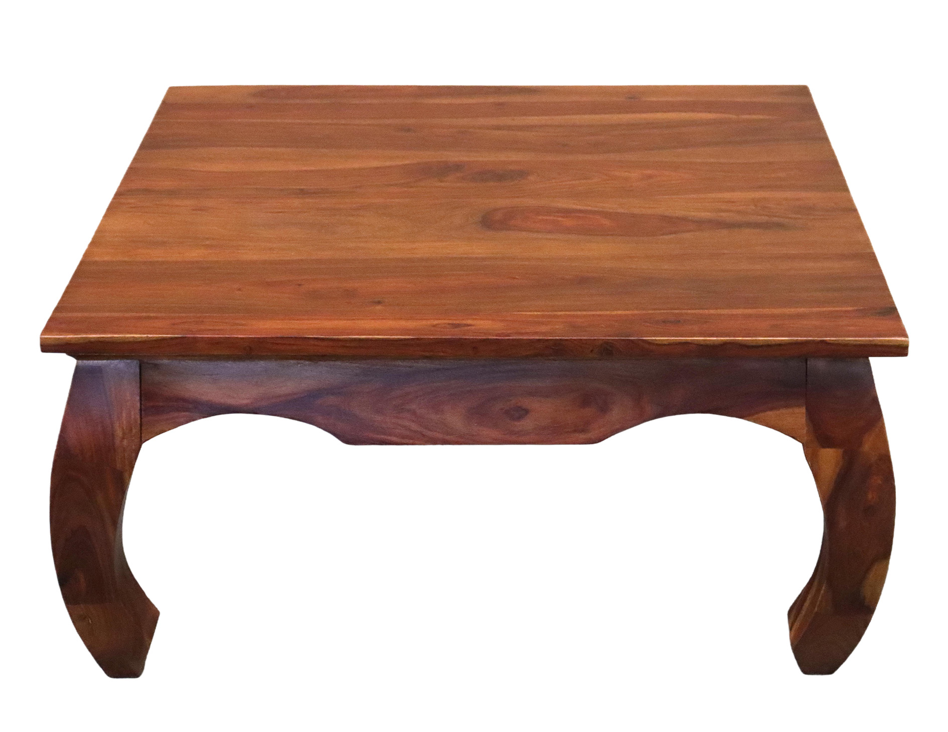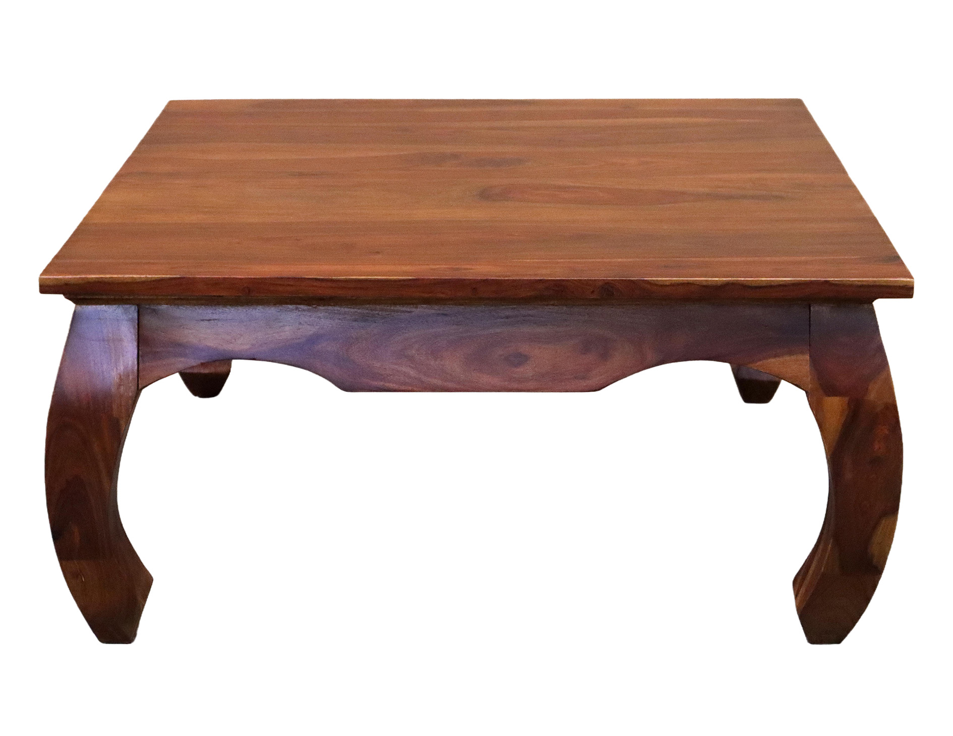 Kwadratowy stolik o boku 100cm idealny do każdego klasycznie zaaranżowanego salonu. Jest wybarwiony w pięknym, jasnym odcieniu brązu, który podkreśla ciekawe usłojenie naturalnego drewna palisandru indyjskiego. Został wykonany w 100% z litego drewna, posiada unikatowe gięte nogi w styli tzw. opium, co staje się jego niewątpliwym atutem estetycznym.