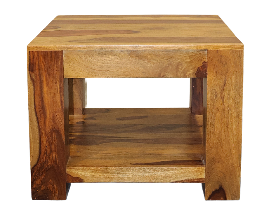 Stolik kolonialny o niewielkim kwadratowym blacie został wykonany w 100% z litego drewna palisandru indyjskiego. Taki podręczny mebel znajdzie swoje miejsce w każdym, nawet małych rozmiarów, salonie. Jego prosta, masywna konstrukcja z półeczką na dole, wpisze się nie tylko w nowoczesne wnętrze.