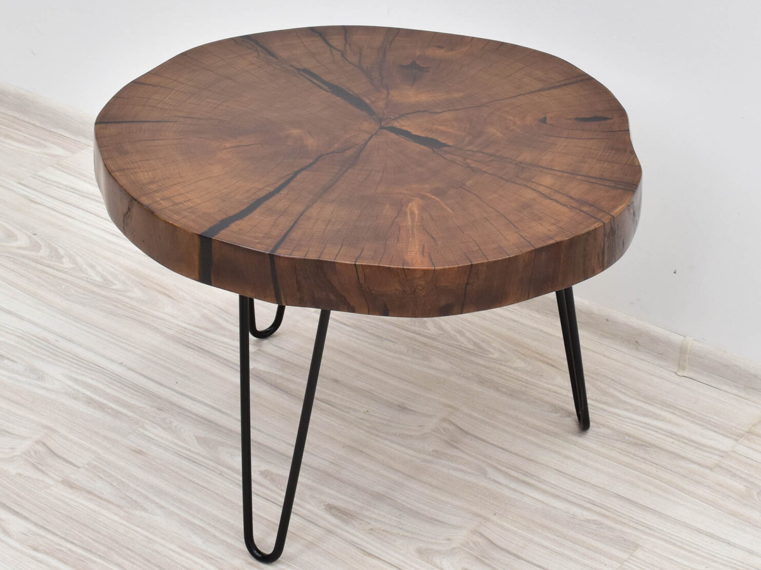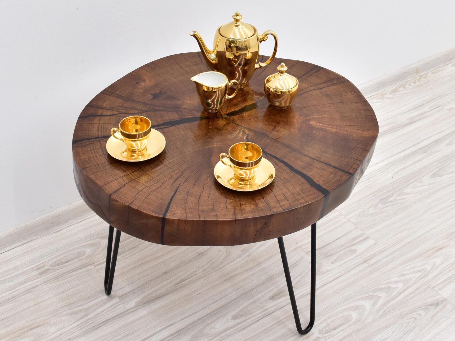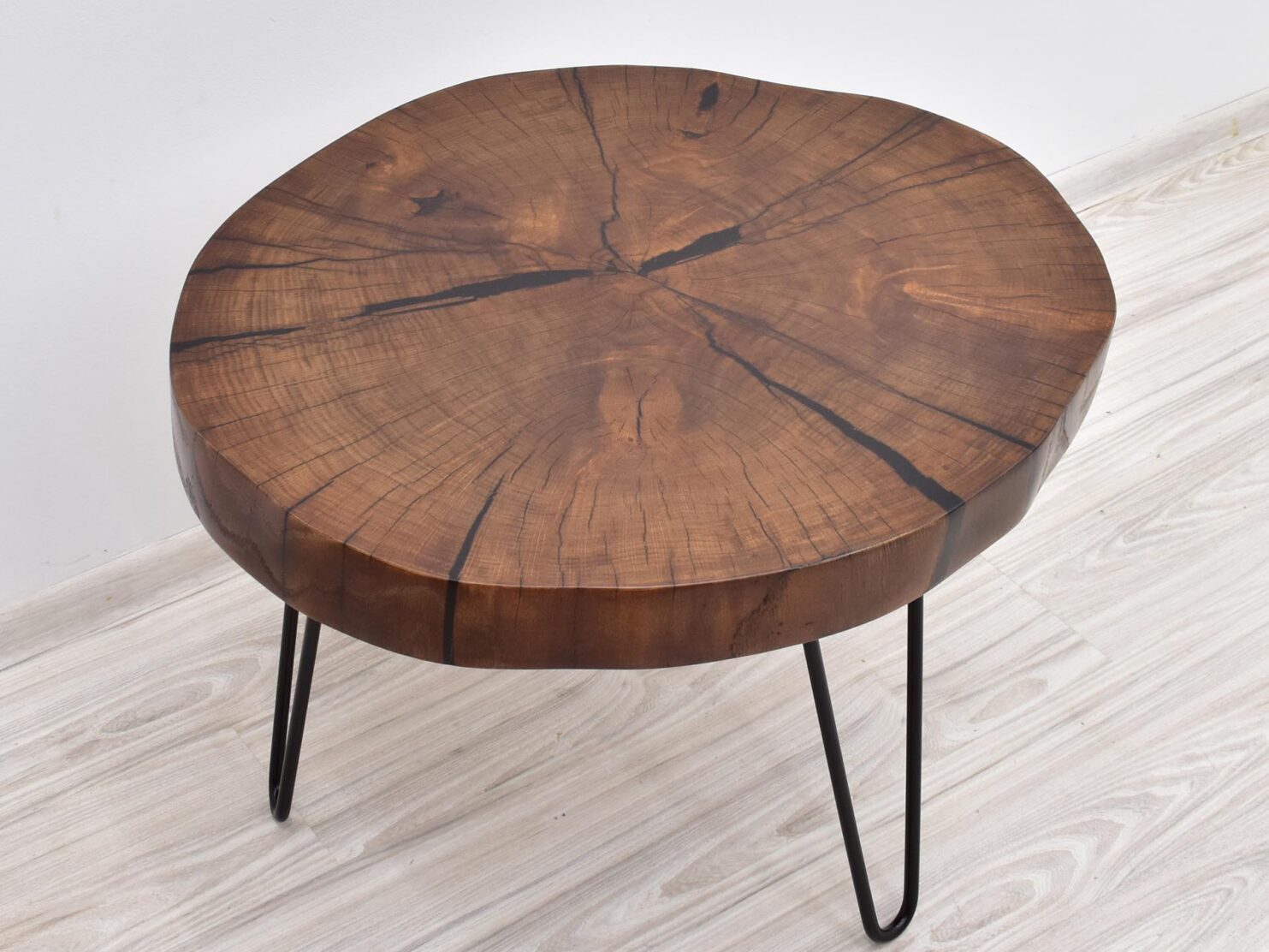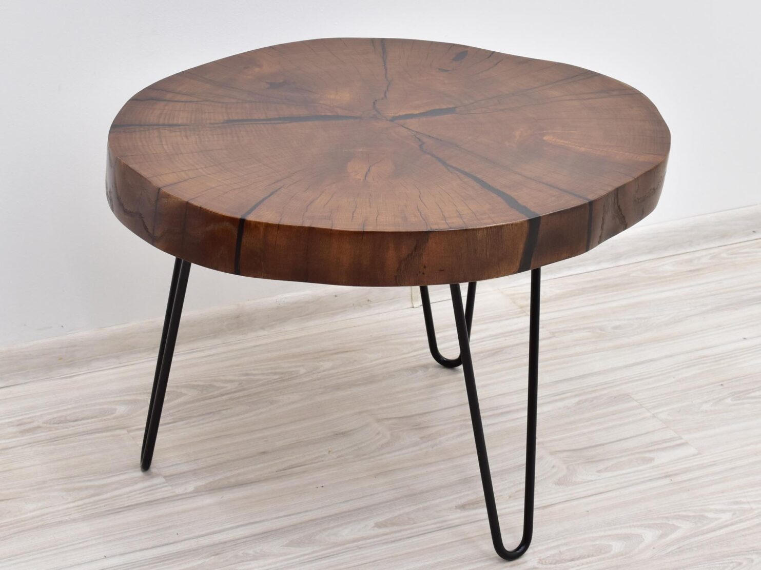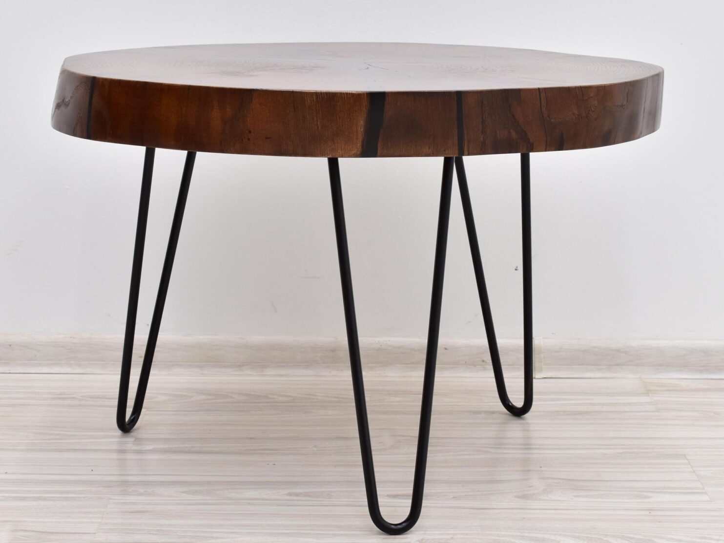 Unikatowy stolik kawowy w nowoczesnym stylu z blatem wybarwionym w pięknym odcieniu brązu. Stolik stanowi rękodzieło – blat wykonany został z plastra litego drewna dębu o grubości 7 cm, wypełnionego żywicą epoksydową, następnie olejowanego i osadzonego na inspirowanych stylem modernistycznym metalowych nogach malowanych proszkowo.