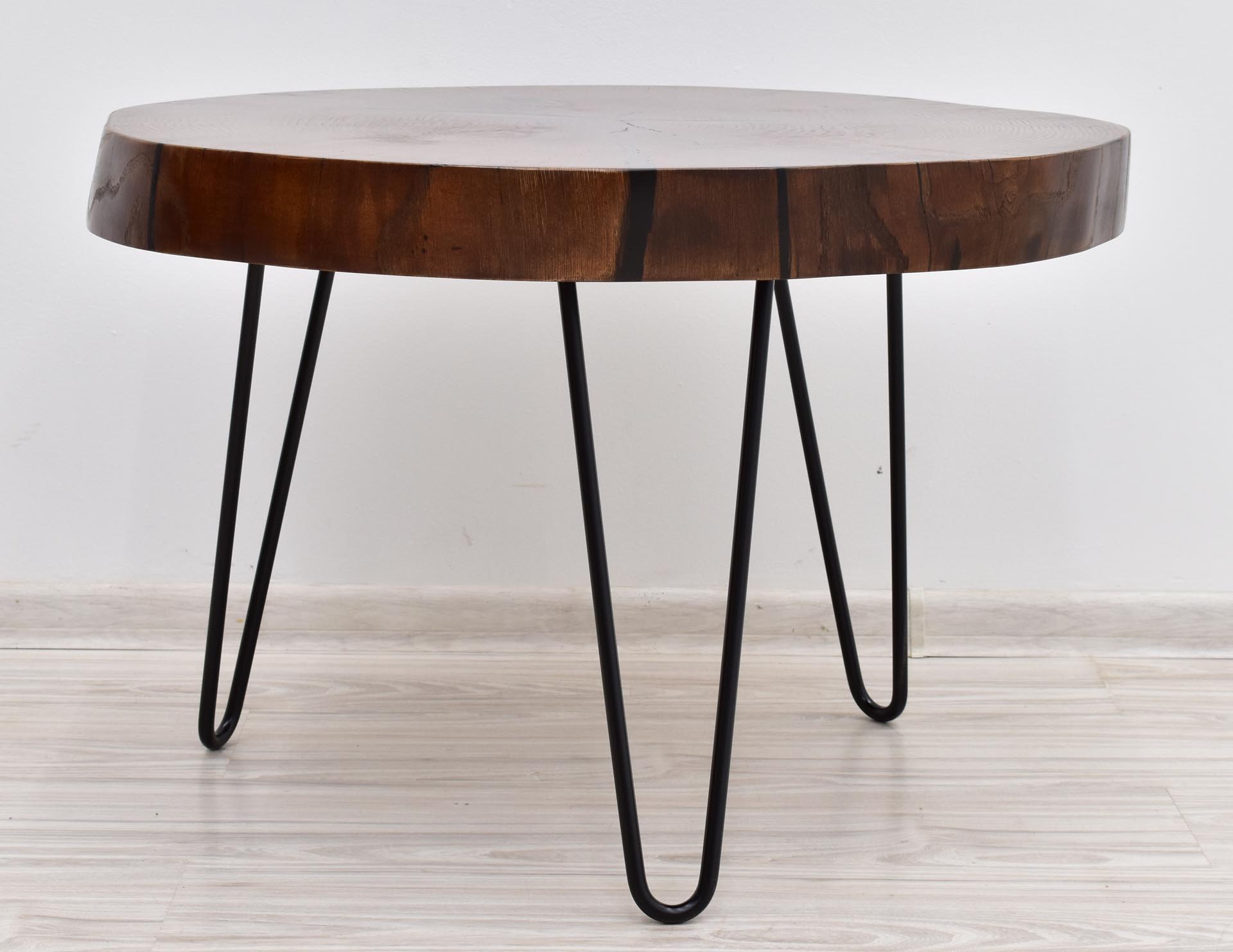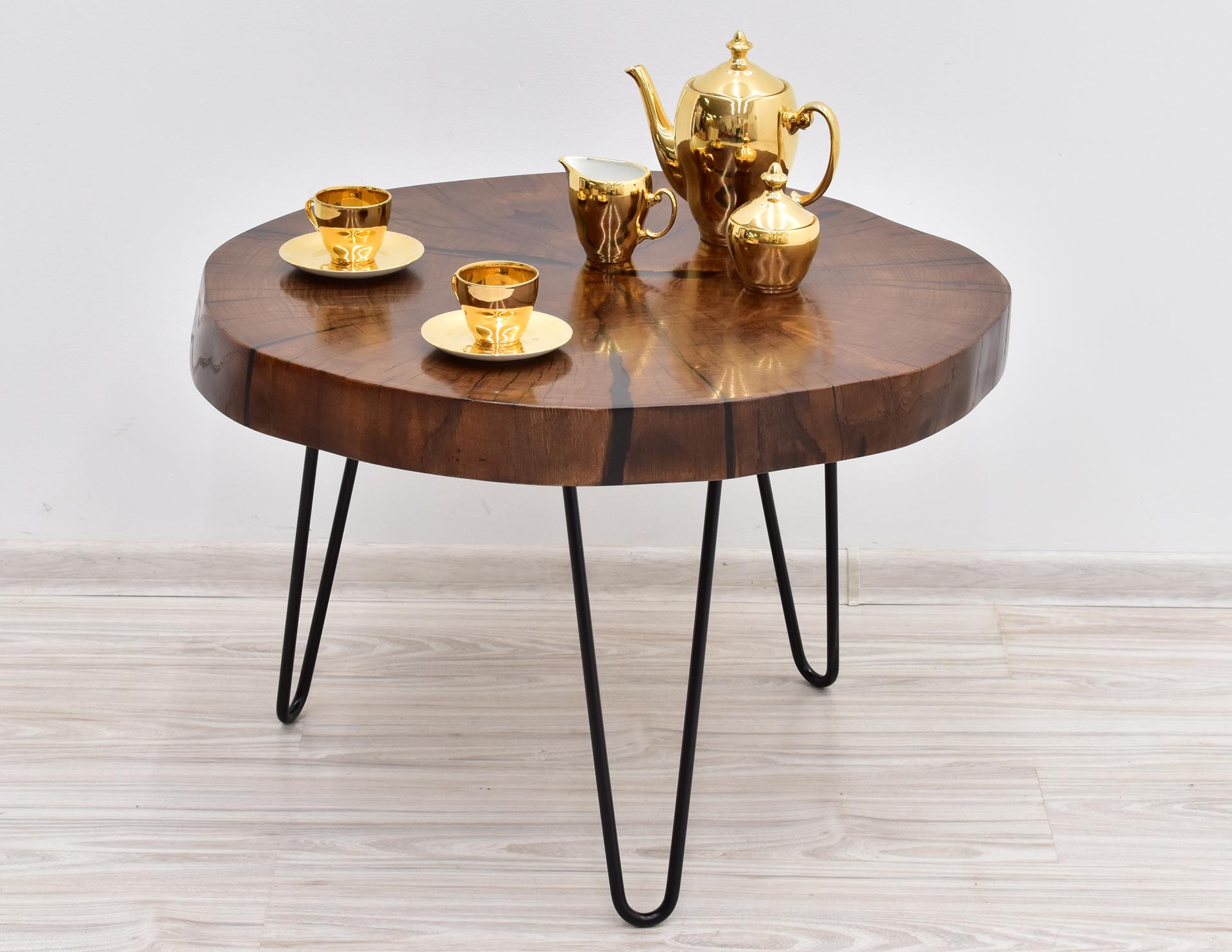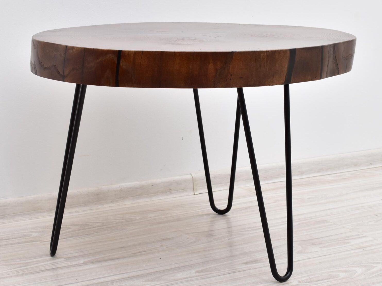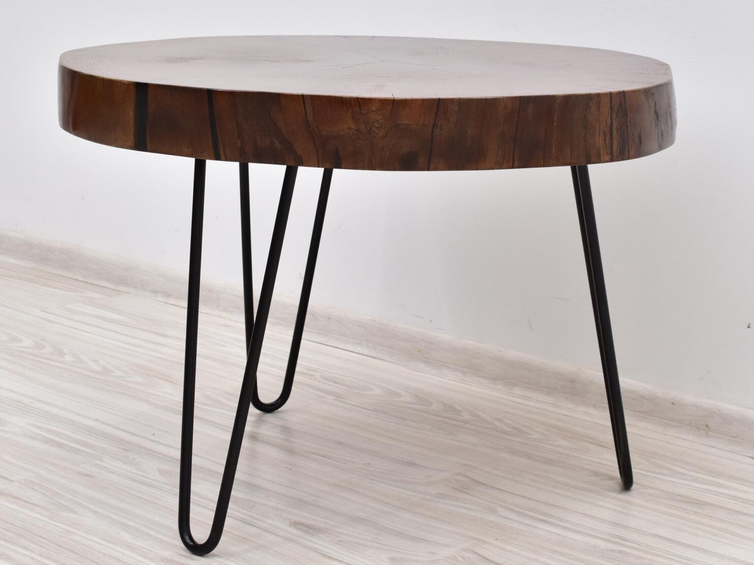 Unikatowy stolik kawowy w nowoczesnym stylu z blatem wybarwionym w pięknym odcieniu brązu. Stolik stanowi rękodzieło – blat wykonany został z plastra litego drewna dębu o grubości 7 cm, wypełnionego żywicą epoksydową, następnie olejowanego i osadzonego na inspirowanych stylem modernistycznym metalowych nogach malowanych proszkowo.