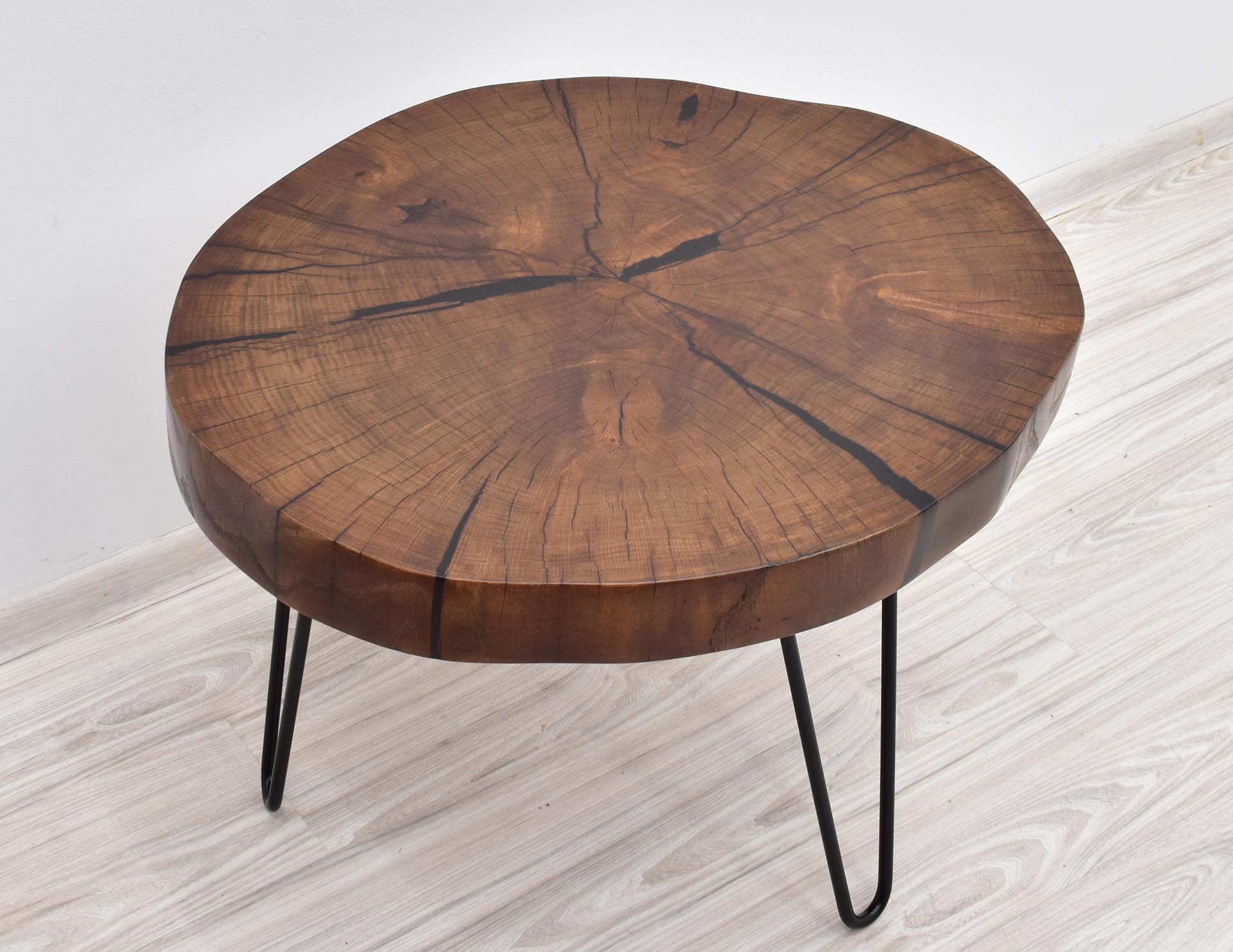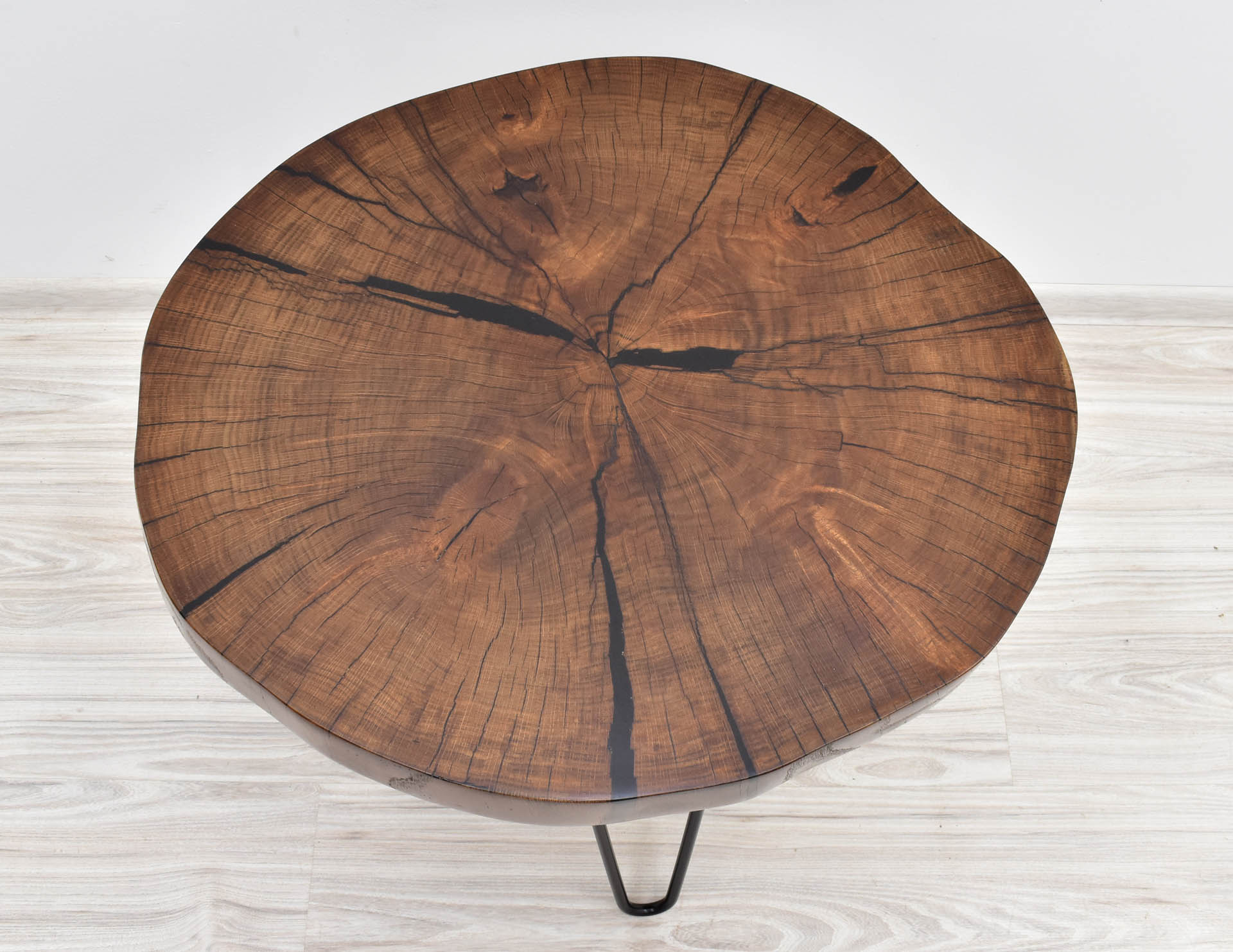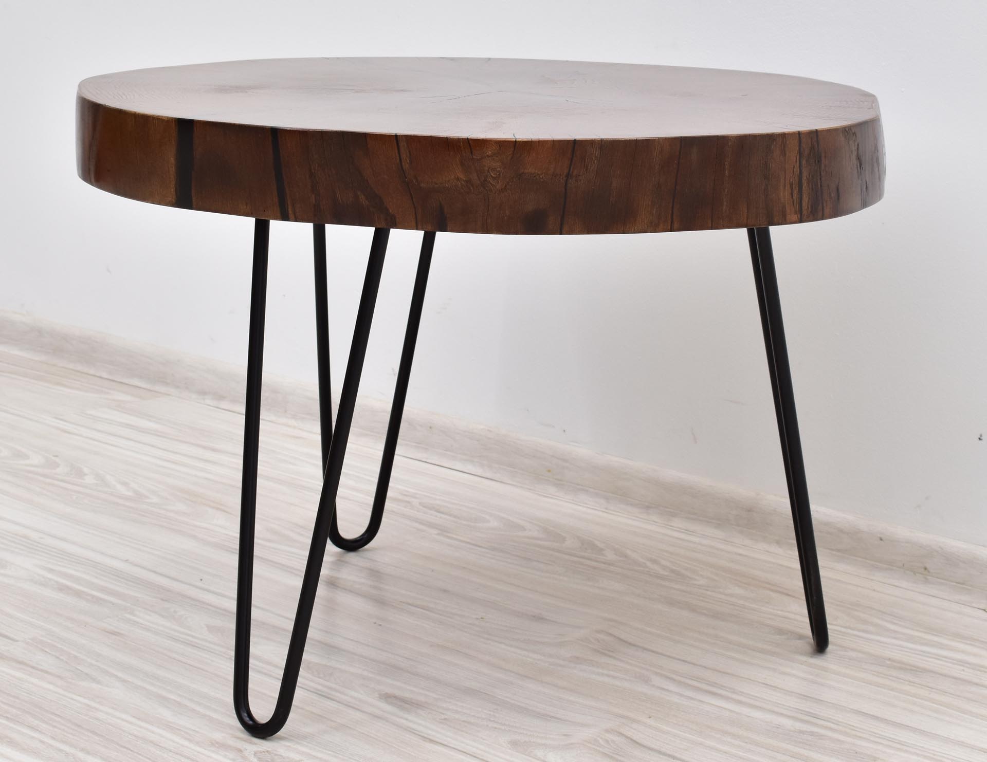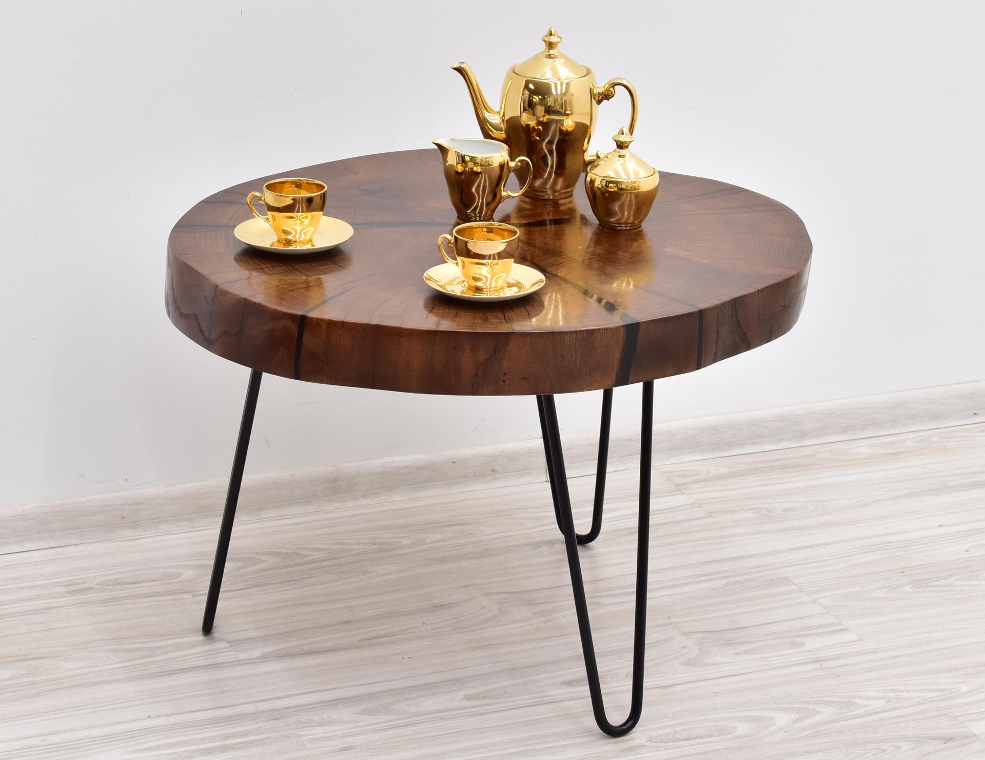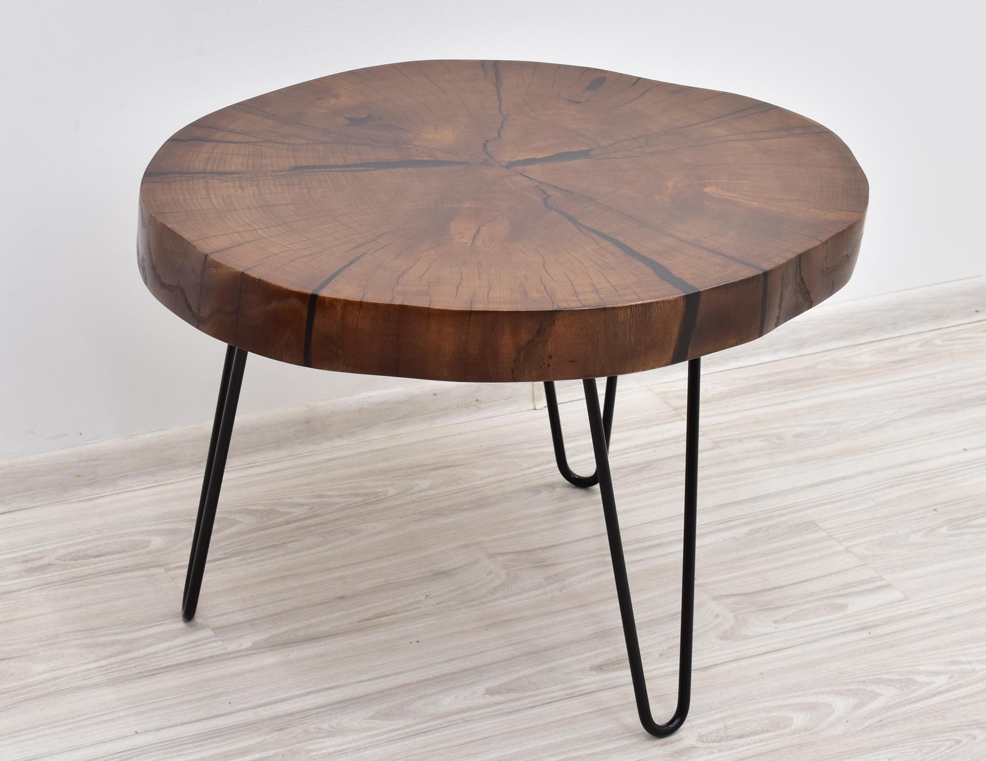 Unikatowy stolik kawowy w nowoczesnym stylu z blatem wybarwionym w pięknym odcieniu brązu. Stolik stanowi rękodzieło – blat wykonany został z plastra litego drewna dębu o grubości 7 cm, wypełnionego żywicą epoksydową, następnie olejowanego i osadzonego na inspirowanych stylem modernistycznym metalowych nogach malowanych proszkowo.