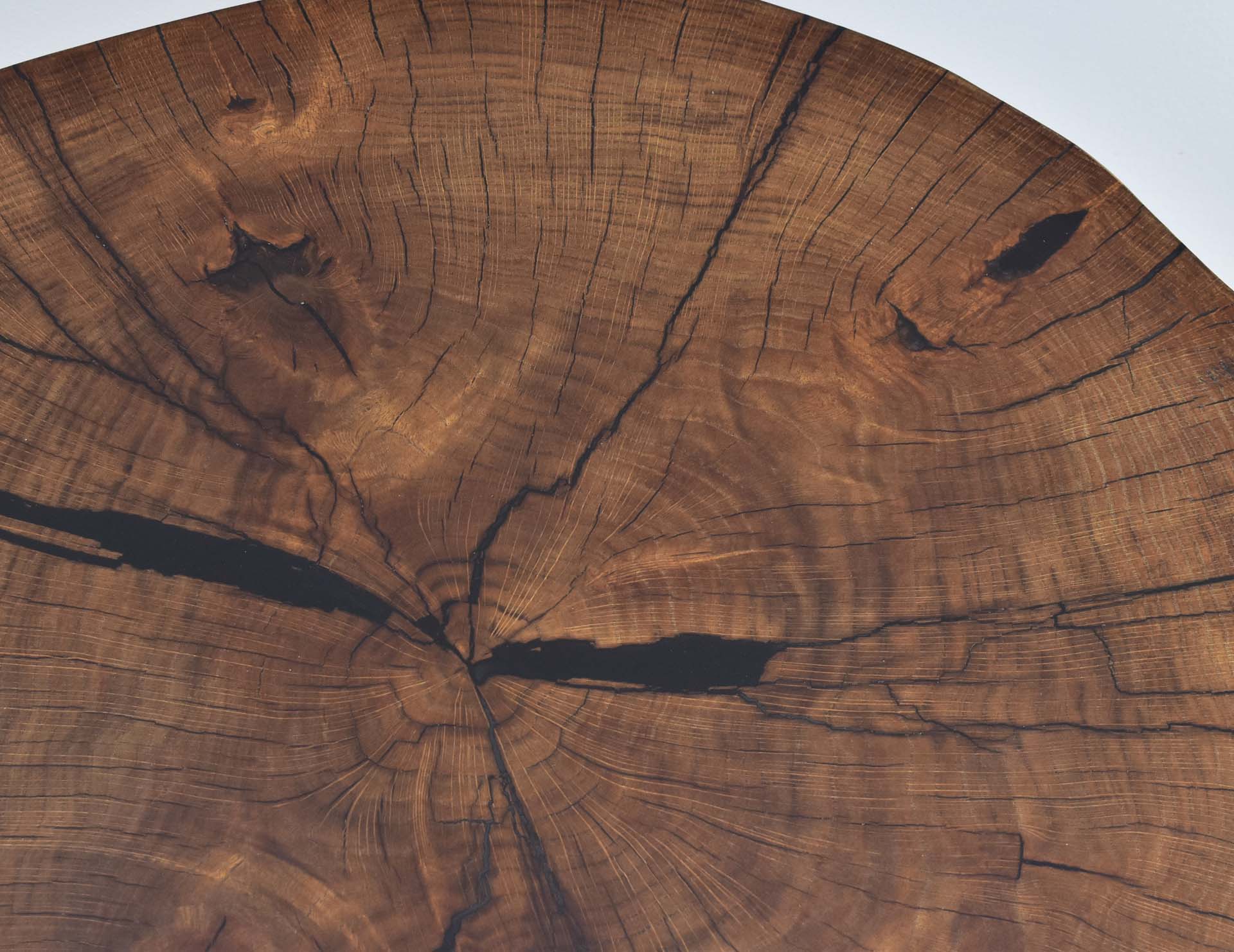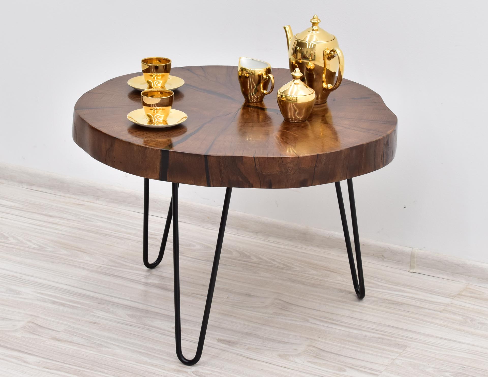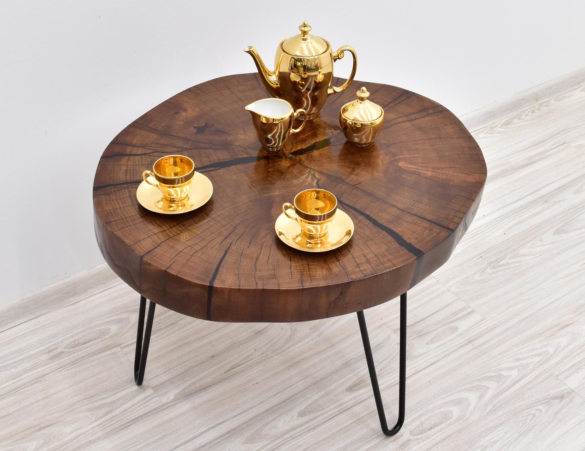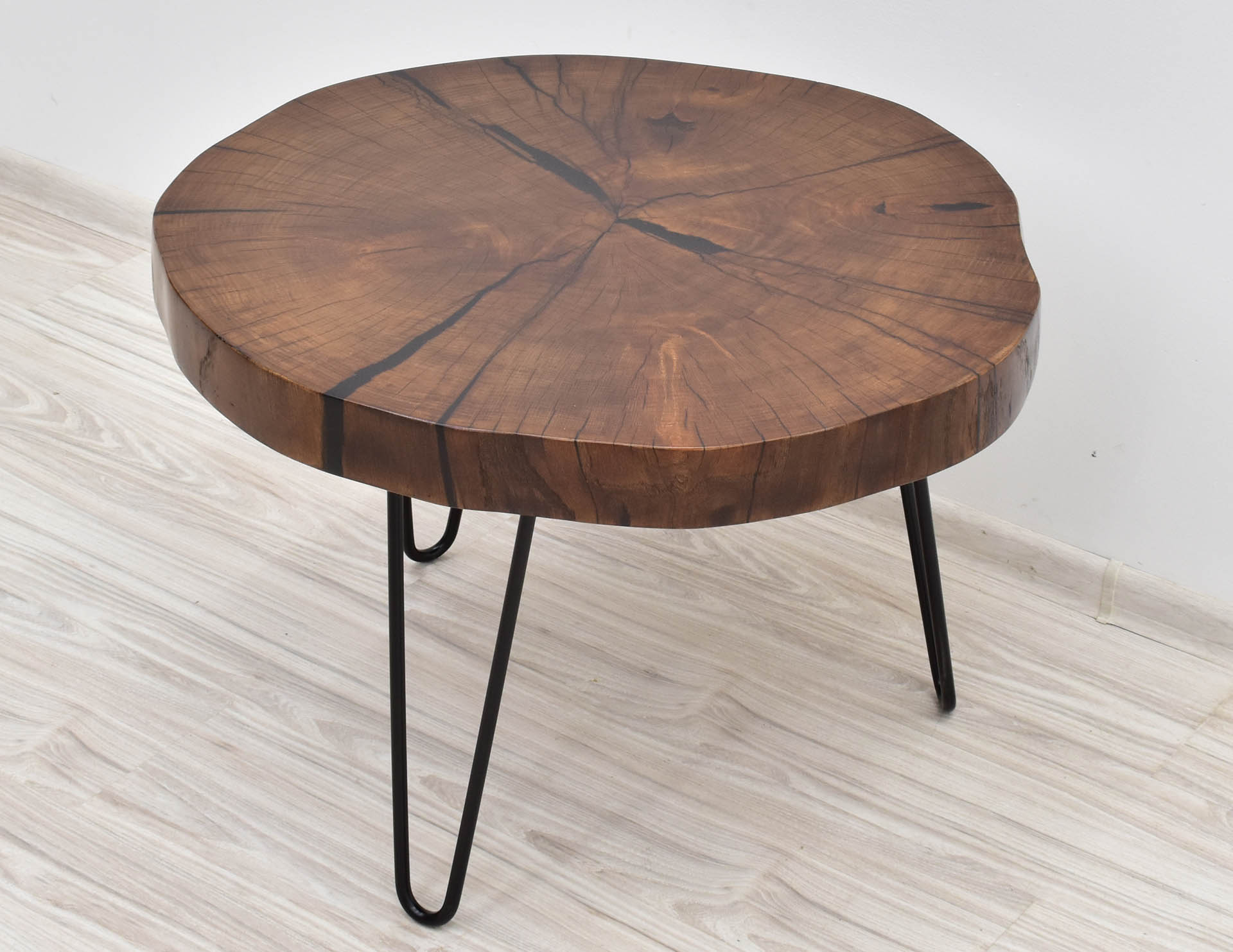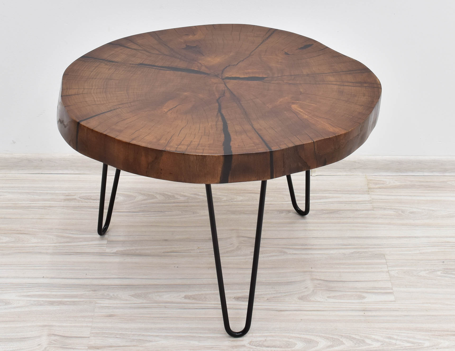 Unikatowy stolik kawowy w nowoczesnym stylu z blatem wybarwionym w pięknym odcieniu brązu. Stolik stanowi rękodzieło – blat wykonany został z plastra litego drewna dębu o grubości 7 cm, wypełnionego żywicą epoksydową, następnie olejowanego i osadzonego na inspirowanych stylem modernistycznym metalowych nogach malowanych proszkowo.