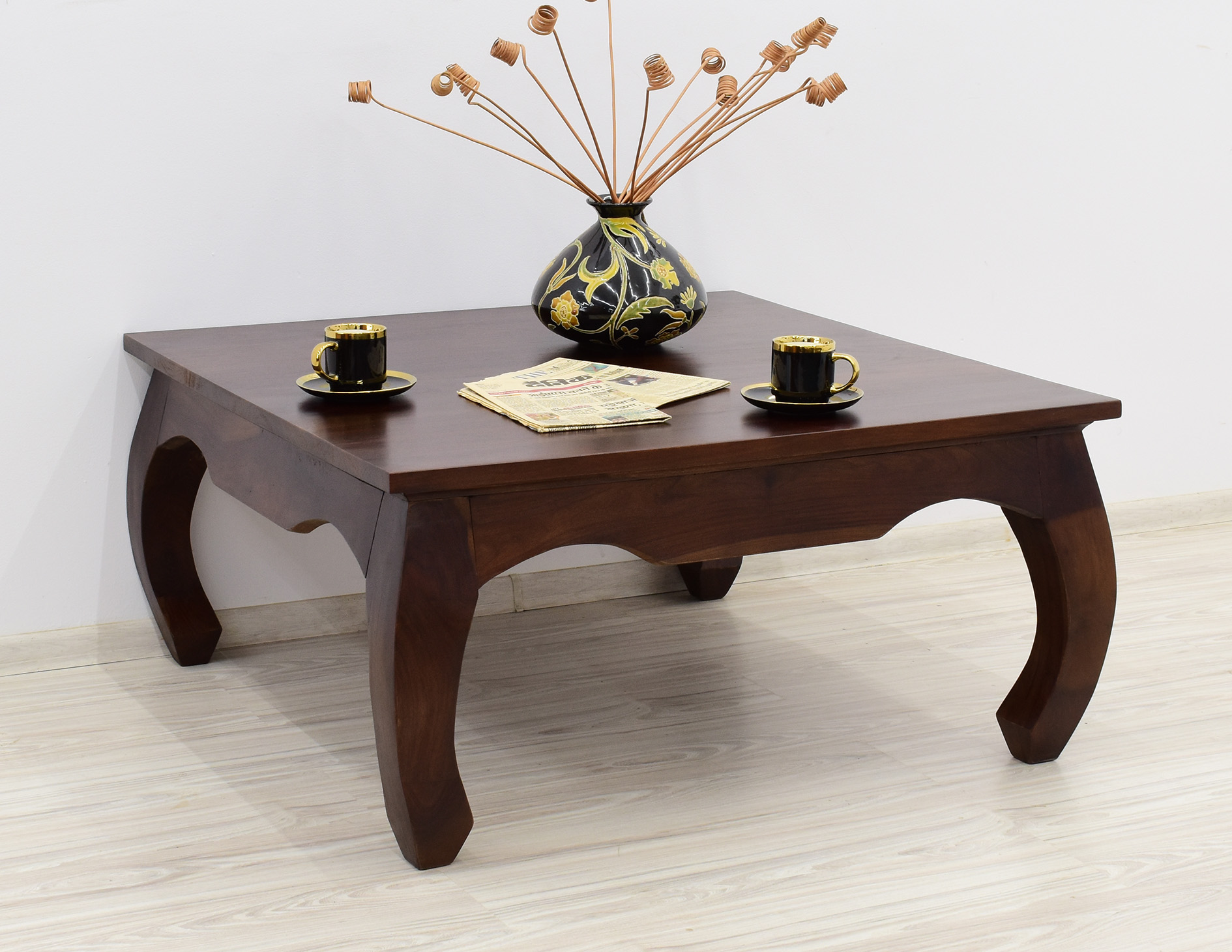 Niewielki stolik kawowy z okrągłym blatem i stylowymi, giętymi nogami przymocowanymi do okrągłej podstawy. Ten niesztampowy mebel został stworzony z litego drewna mango. Może stać się unikatowym rozwiązaniem w klasycznie urządzonym salonie.