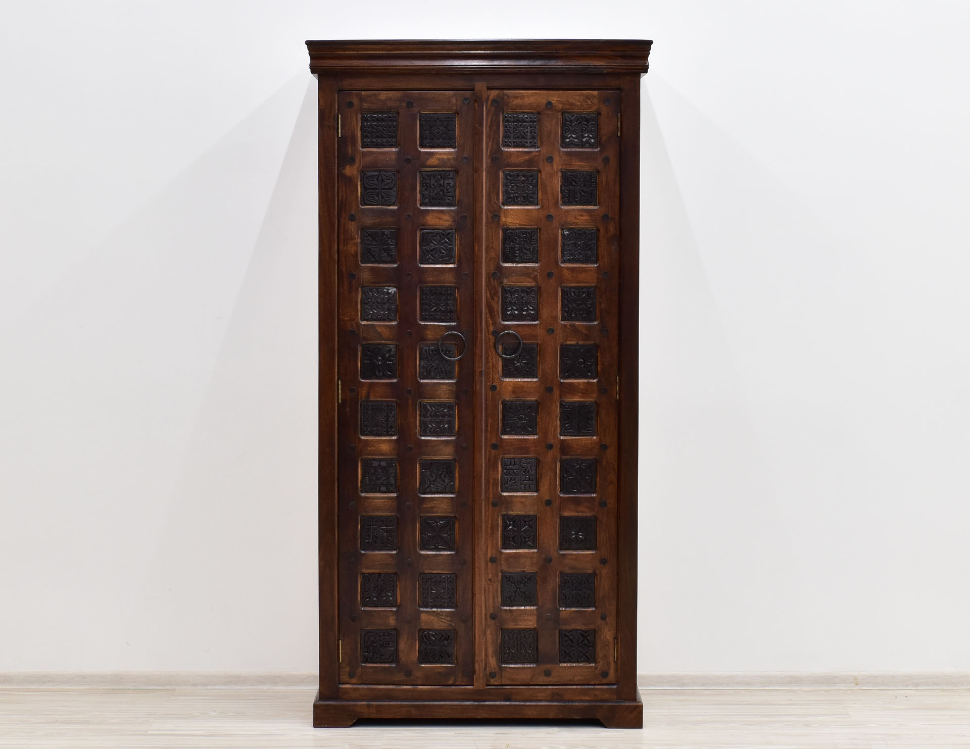 Dwudrzwiowa szafa kolonialna wykonana została w 100% z litego drewna akacji indyjskiej. Posiada cztery wysokie, pojemne wnęki za dwoma bogato zdobionymi drzwiczkami. Na drzwiczkach, niczym na kwadratowych drewnianych kafelkach, dokonano ręcznych, misternych wyrzeźbień. Wzory przypominają motywy zaczerpnięte ze świata flory. Dodatkowym egzotycznym akcentem są metalowe ćwieki oraz uchwyty. Całość w ciemnym brązie, tylko wspomniane motywy wybarwiono na odcień bliski czerni. Szafa z akacji indyjskiej jest unikatem, gdyż ze względu na to, że wykonano ją ręcznie nie może być mowy o dwóch identycznych egzemplarzach.