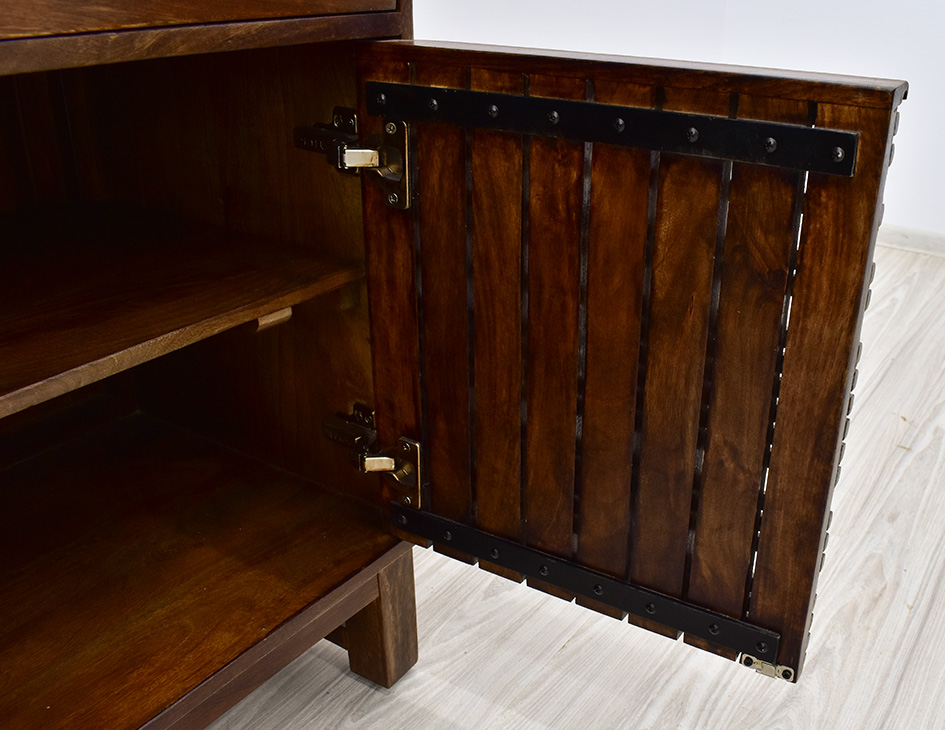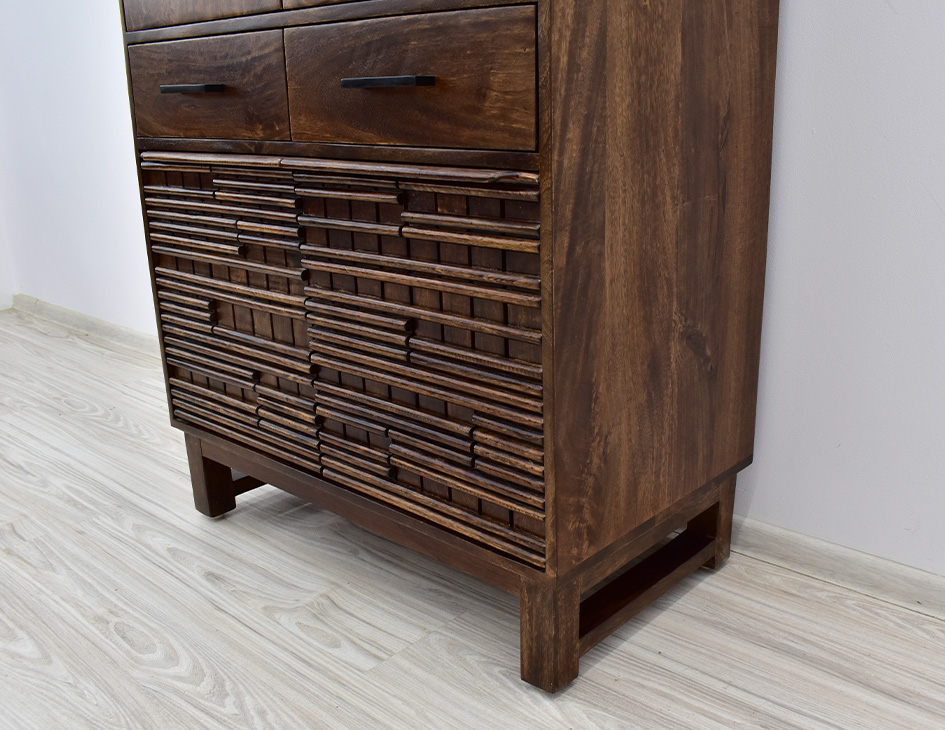 Wszystkie elementy szafy zostały starannie wykończone, podkreślając usłojenie drewna mango, które dodaje meblowi ciepła i przytulności. Powierzchnia szafy przywodzi na myśl kolonialne tradycje, a jednocześnie harmonijnie komponuje się z nowoczesnymi aranżacjami.