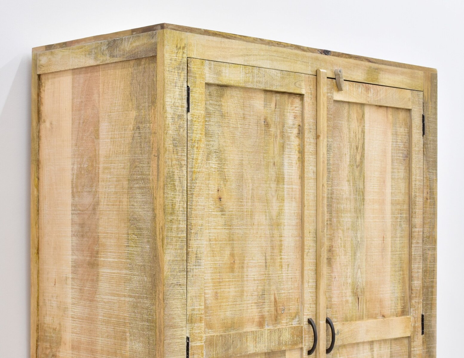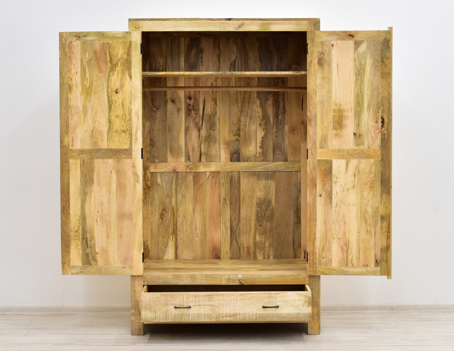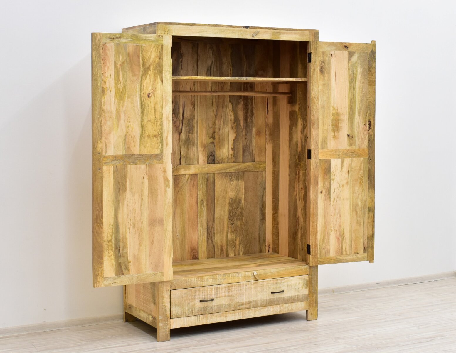 Jasna szafa kolonialna wykonana w 100% z litego drewna mango. Szafa posiada jedną długą szufladę, półkę oraz pałąk. Nietuzinkowa struktura drzewa mango w swej naturalnej odsłonie nadaje każdemu okazowi unikatowy charakter. Ten mebel indyjski stanie się ozdobą każdego pomieszczenia, w którym panuje surowy klimat w stylu industrialnym, gdzie myślą przewodnią jest minimalistyczne podejście do przestrzeni.