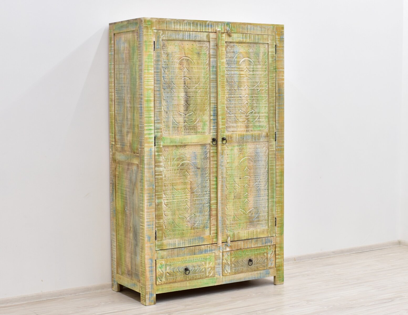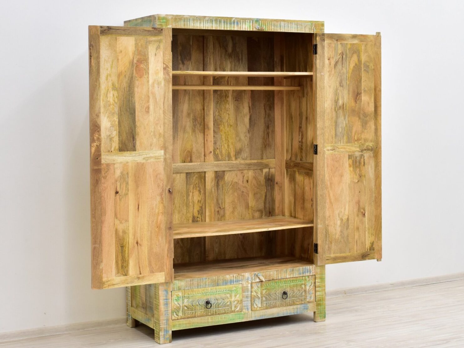Indyjska szafa stworzona w Indiach ze 100% litego drewna mango. Mebel ten posiada pałąk do wieszania, dwie półki oraz dwie szuflady na dole. Całość została poddana zabiegowi celowego postarzania, poprzez nałożenie kilku pastelowych barw na siebie i późniejszym ich przetarciu.