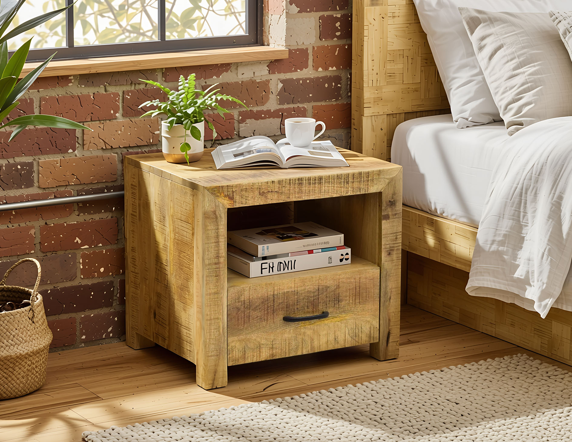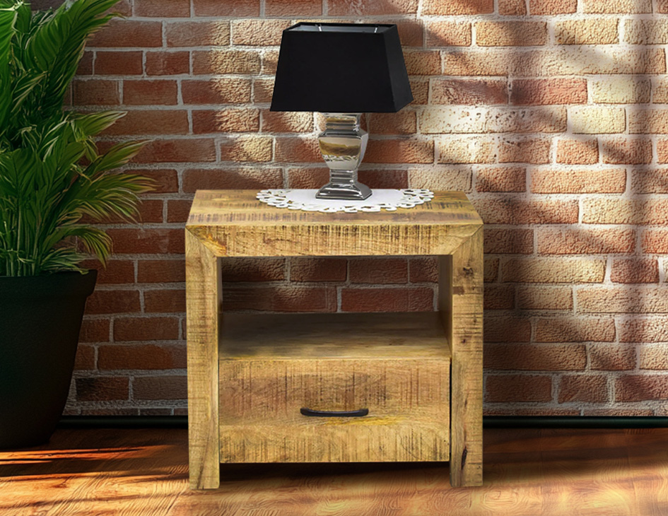 Jasny stolik nocny wykonany w 100% z litego drewna mango swoją bryłą oraz surowością jasnego drewna doskonale wpisująca się w nurt modernistyczny. Posiada szufladkę oraz półkę umiejscowioną nad szufladką. W naszym salonie można stworzyć nietuzinkowy komplet sypialniany składający się z łóżka z drewna mango, szafek nocnych i komody mango w stylu loft.