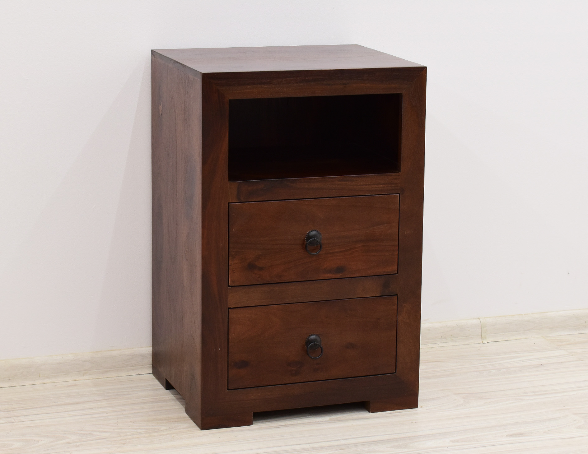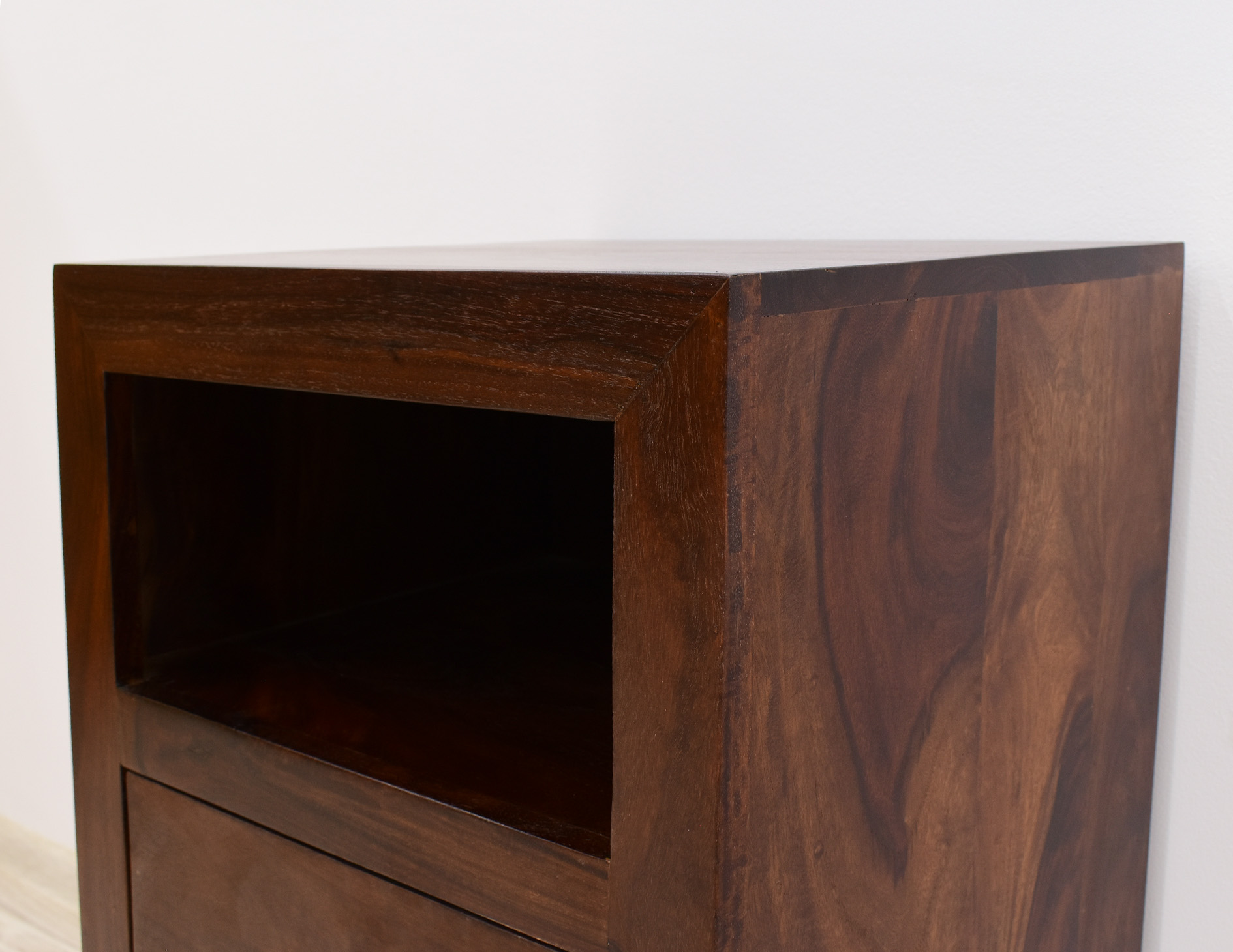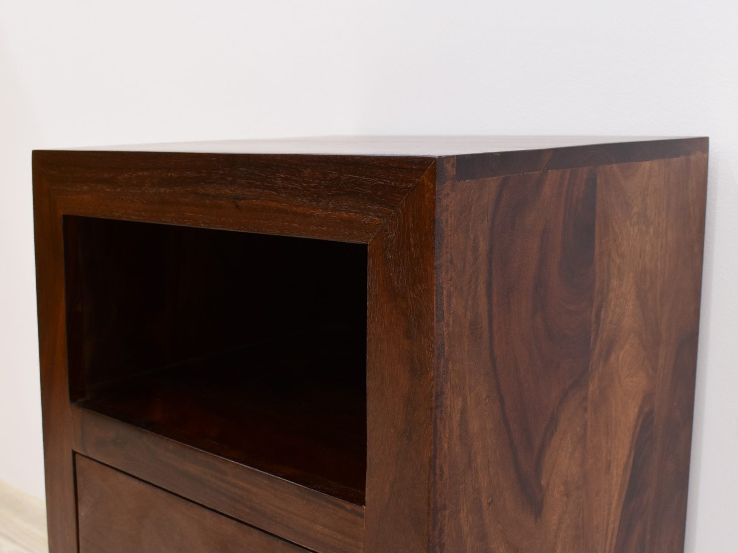 Szafka nocna z palisandru indyjskiego w bardzo prostej formie z otwartą wnęką i dwiema szufladkami. Całość stworzona z litego drewna egzotycznego drzewa palisandru indyjskiego, inaczej zwanego drzewem różanym.
