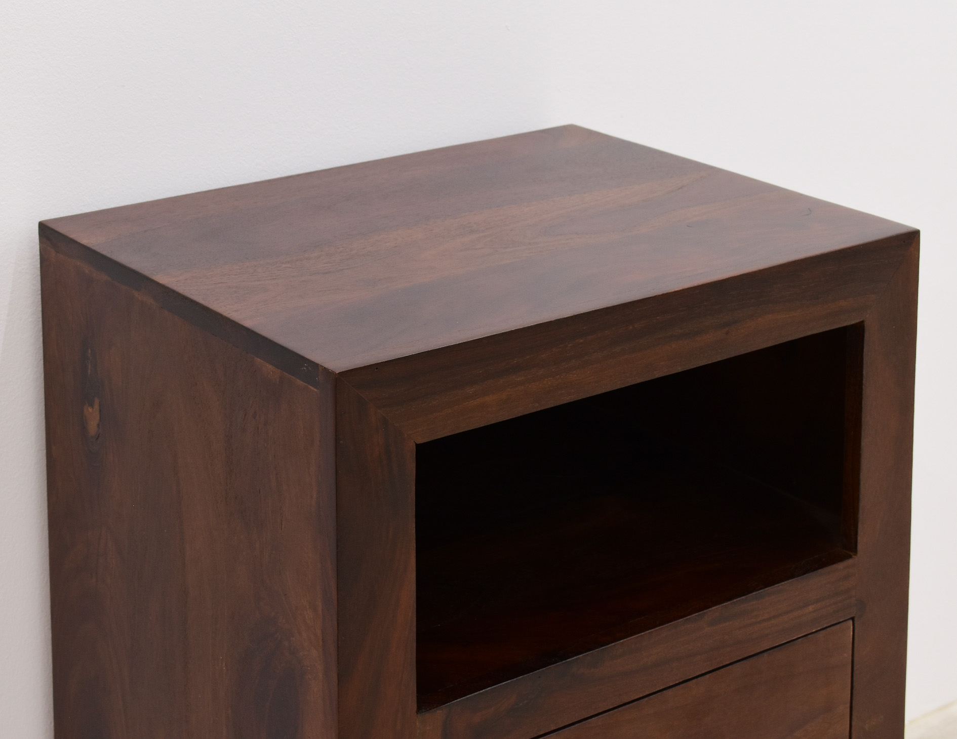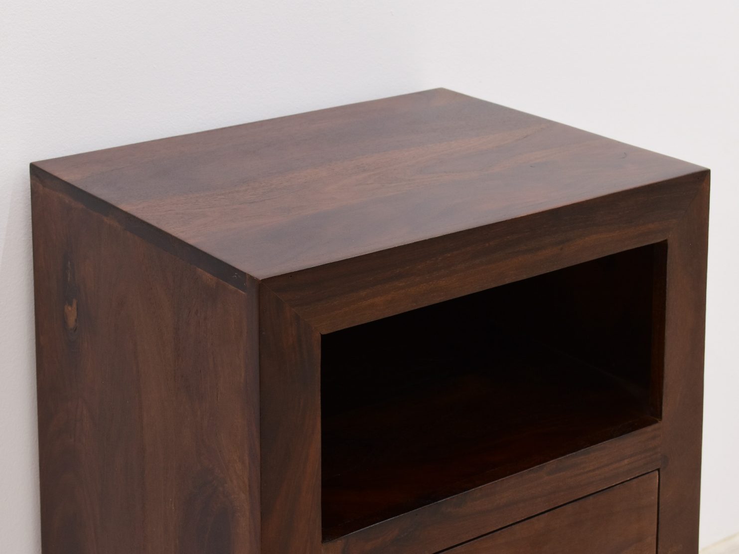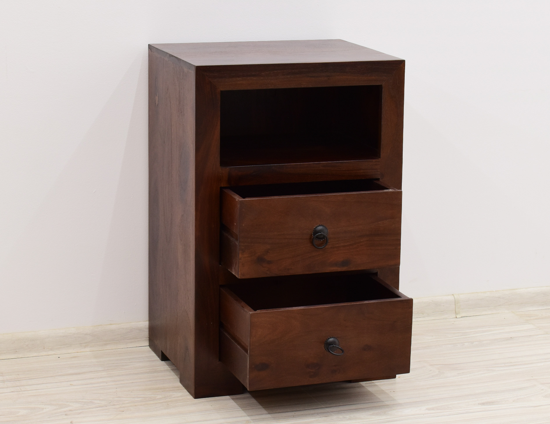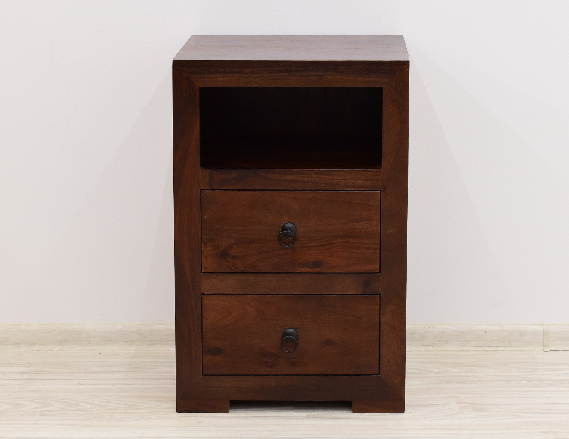Szafka nocna z palisandru indyjskiego w bardzo prostej formie z otwartą wnęką i dwiema szufladkami. Całość stworzona z litego drewna egzotycznego drzewa palisandru indyjskiego, inaczej zwanego drzewem różanym.