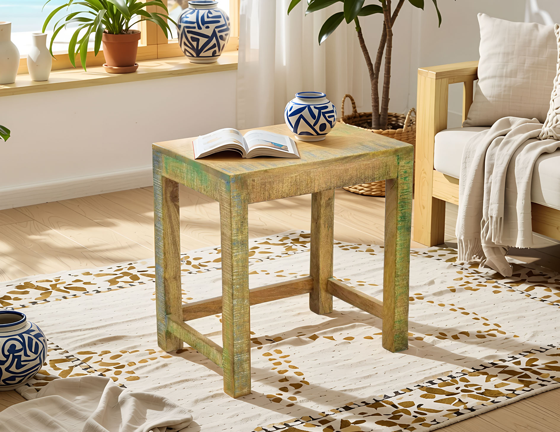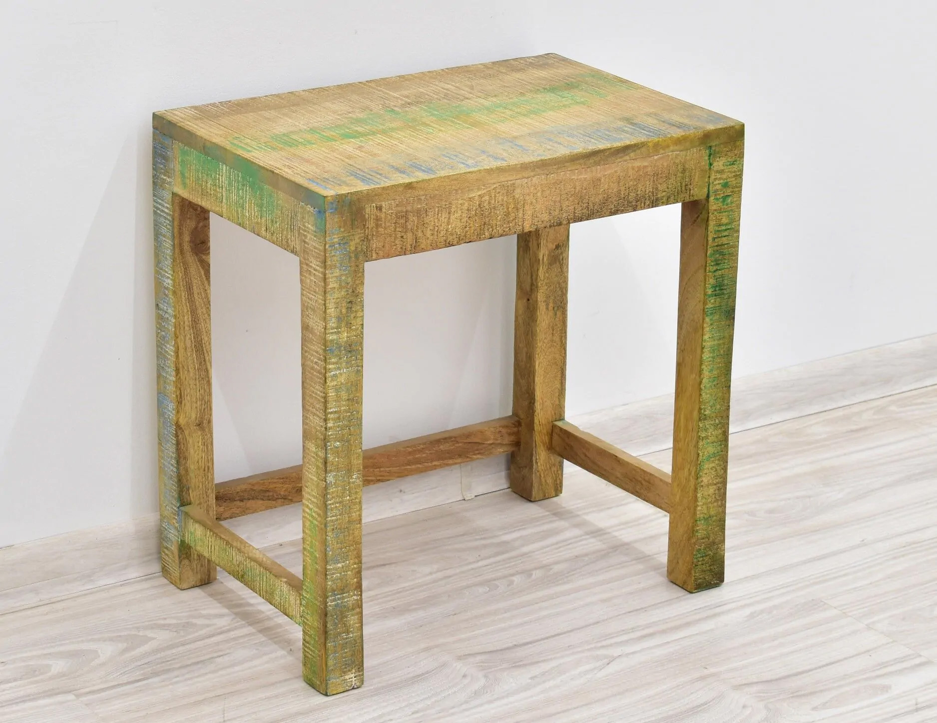 Duży taboret kolonialny z pastelowymi przecierkami wykonany w 100% z litego drewna mango.