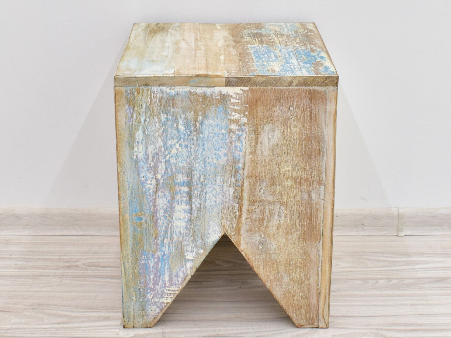 Stylowy taboret kolonialny w jasnym kolorze, z pastelowymi przetarciami. Stworzony w indyjskiej małej manufakturze, nosi ślady tamtejszego stylu w meblarstwie. Jego unikatowy kształt może stać się delikatnym, egzotycznym akcentem w każdym domu.