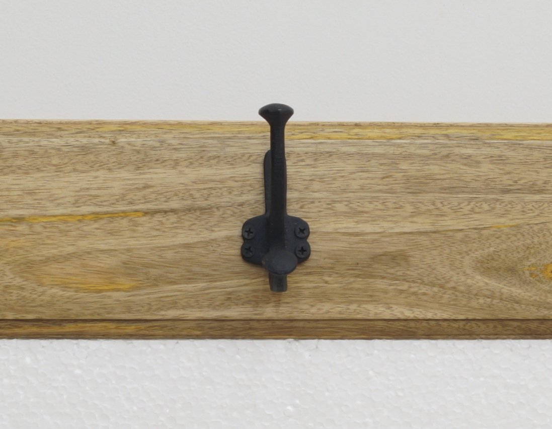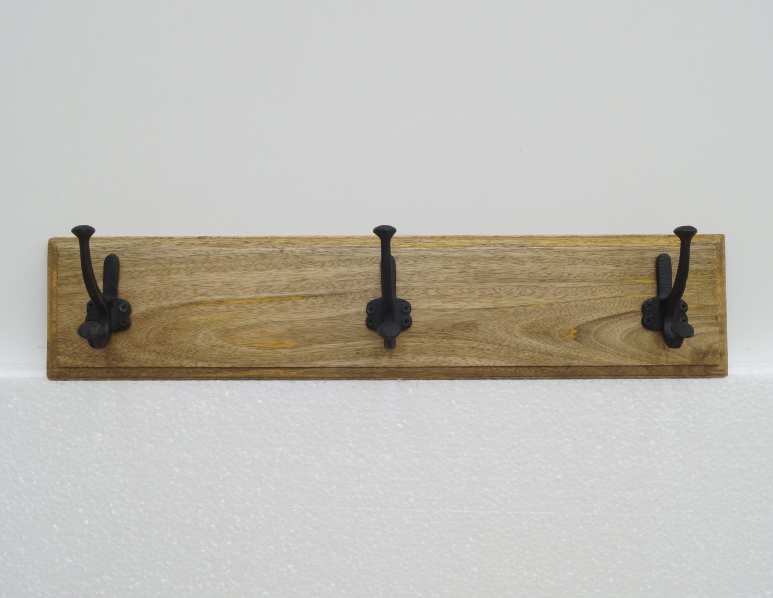 Kolonialny wieszak na ścianę zbudowany z deseczki o długości 60cm i trzech haków. Deseczka w naturalnym kolorze drewna mango. Podwójne haki zostały wykonane z żeliwa.