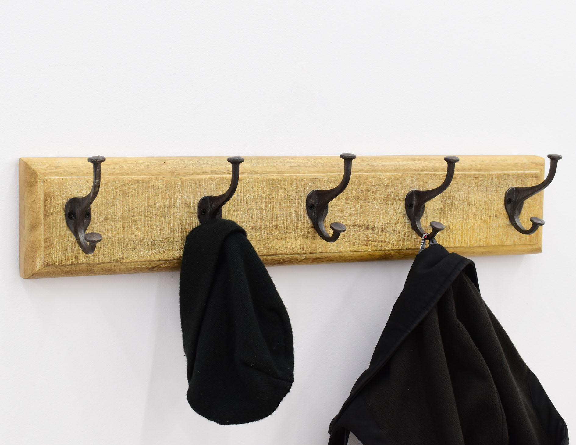 Wieszak ścienny wyposażony we frezowaną deseczkę, wykonaną z litego drewna mango, oraz w pięć podwójnych haków na ubrania. Doskonale sprawdzi się w każdym przedpokoju w industrialnej aranżacji.