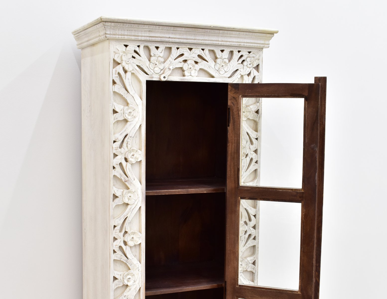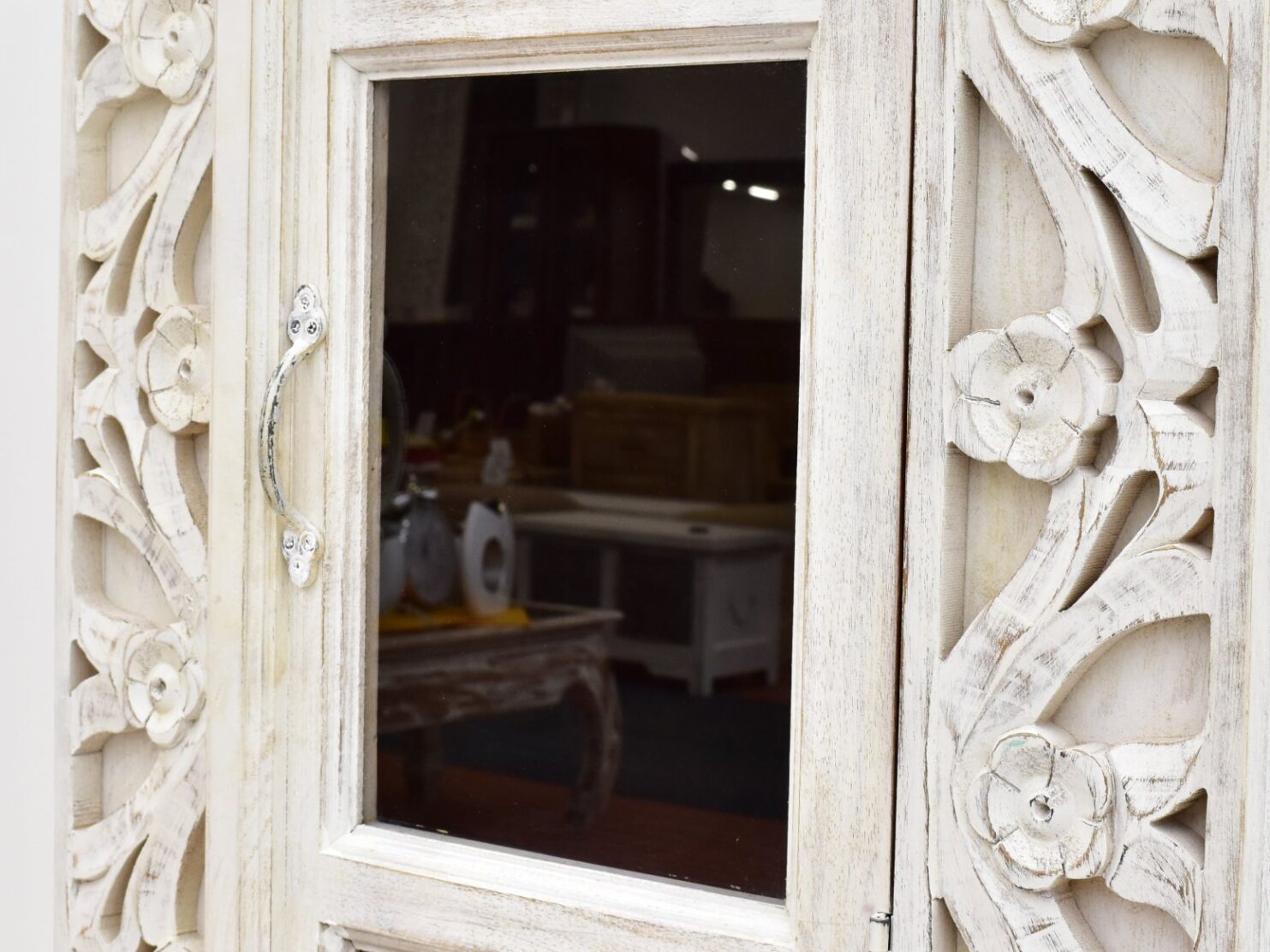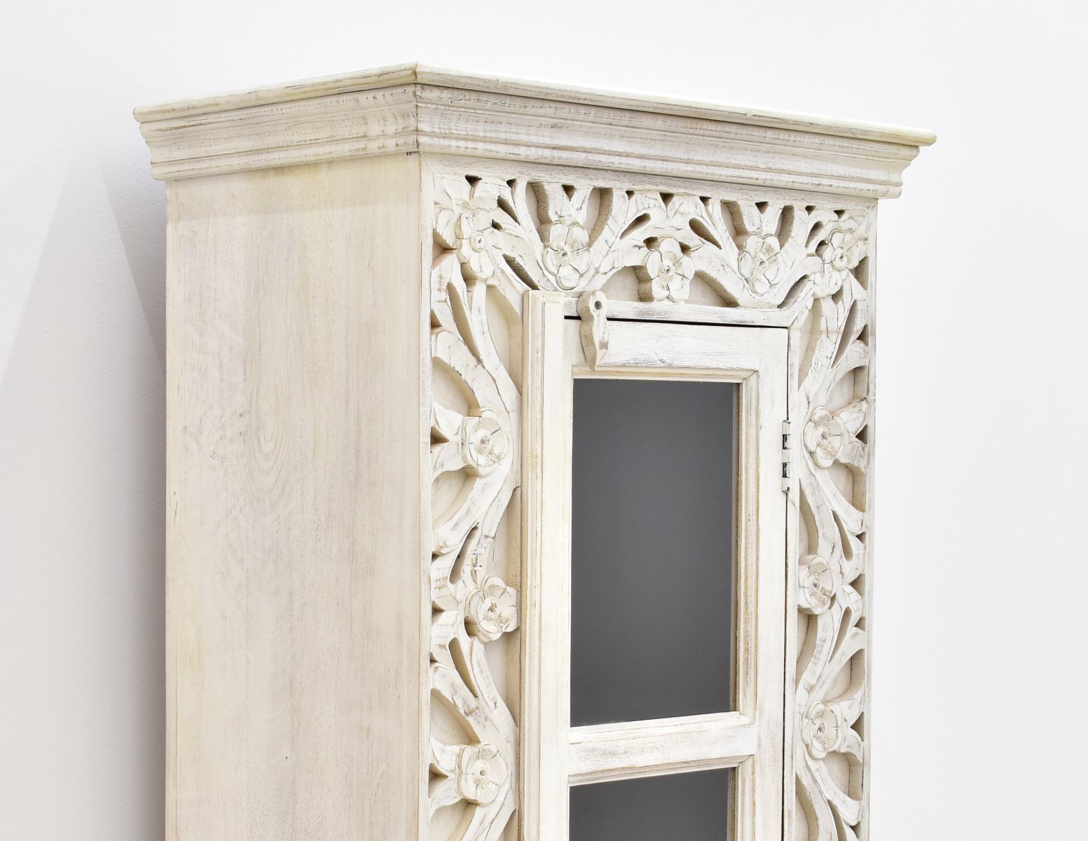 Jednodrzwiowa witryna pomalowana na biało, a następnie przecierana. Posiada cztery wnęki za częściowo przeszklonymi drzwiczkami. Ozdobiona rzeźbieniami w motywy roślinne, umieszczonymi wokół frontowej linii mebla. Jest to mebel niepowtarzalny, stworzony w stylu orientalnym.
