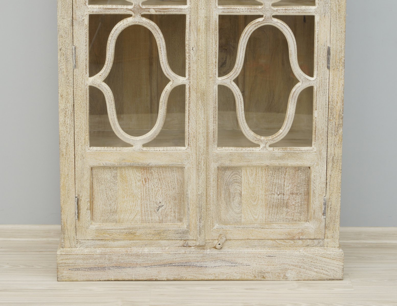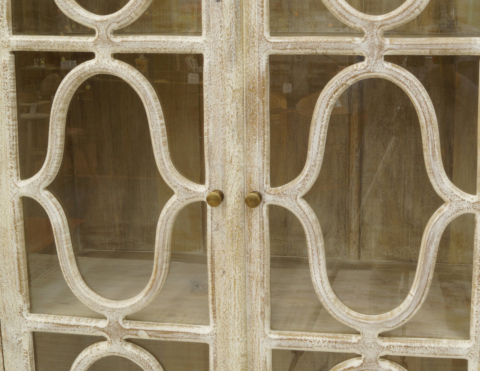 Indyjska witryna z dwoma drzwiczkami. Posiada trzy przeszklone wnęki i jedną zakrytą. Na szybie umieszczono stylową, indyjską dekoracje z drewna. Cały mebel stworzono z litego w 100% drewna mango, który został pomalowany na biało i przecierany.