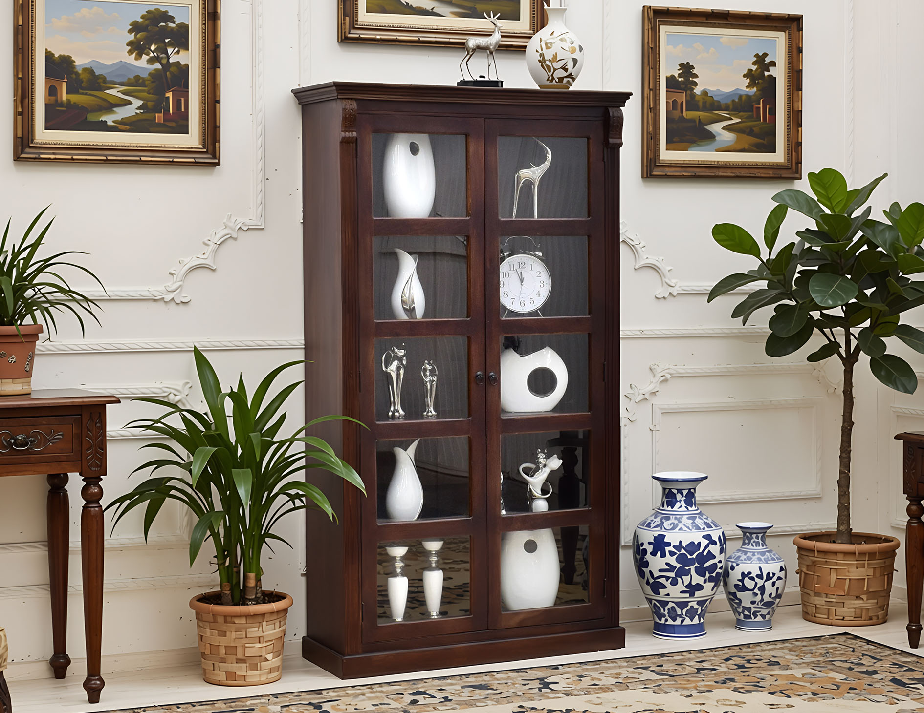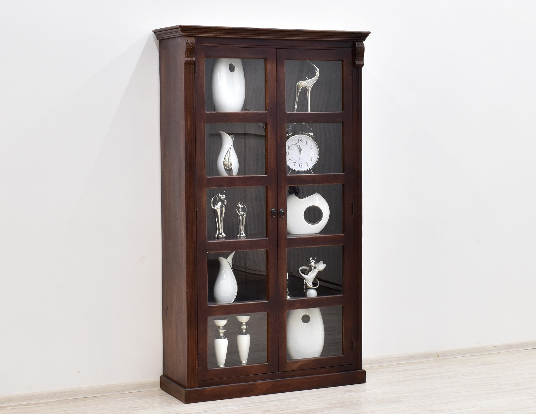 Pojemna, stylowa witryna kolonialna do salonu posiadająca pięć wnęk umieszczonych za przeszklonymi drzwiczkami. Szybę na drzwiczkach dzielą klasyczne szprosy. Mebel bardzo pojemny, trwały i estetyczny. Wykonany w 100% z litego drewna palisandru indyjskiego. Mebel posiada frezowany na brzegach wieniec oraz ręcznie rzeźbione gzymsy, umieszczone na bokach w górnej, frontowej jego części. Ta indyjska witryna może stać się ozdobą każdego salonu. Mebel ten dopełni całości w przytulnym wnętrzu utrzymanym w stylu klasycznym, wiejskim lub kolonialnym.