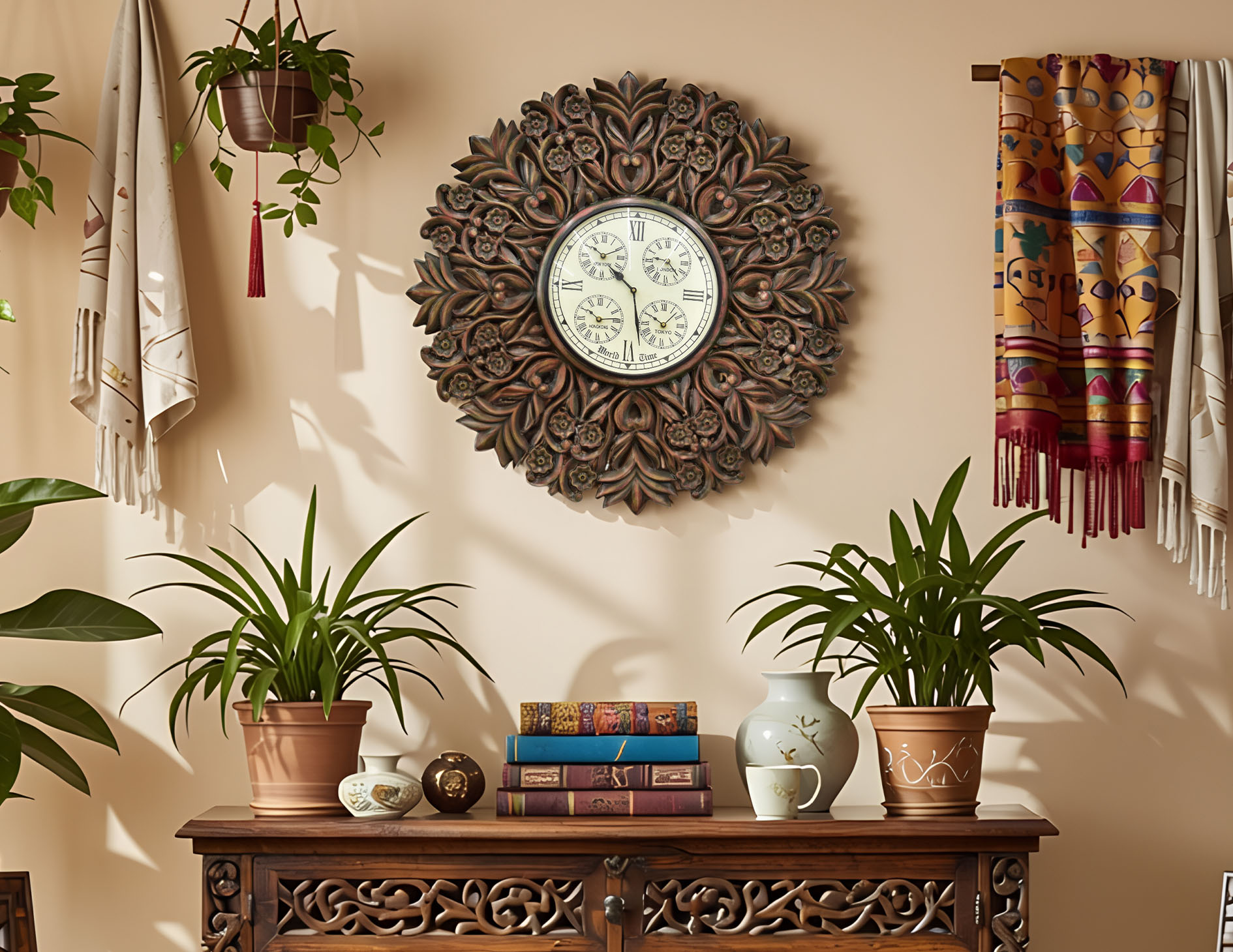 Zegar ścienny indyjski w stylu kolonialnym 75×75 cm rzymskie cyfry unikat