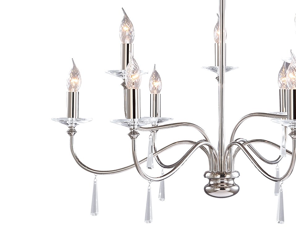 Żyrandol z kolekcji Finsbury Park wykończony w kolorze polerowanego niklu. Posiada dziewięć źródeł światła. Żyrandol ozdobiony został zwisającymi szklanymi soplami. Opcjonalnie z abażurami do wyboru w kolorze kości słoniowej lub szarym. Całość utrzymana w stylu Glamour. Średnica żyrandola wynosi 91 cm, a wysokość konstrukcji 75 cm. Jego całkowita wysokość może być regulowana z minimalnej 83 cm do 166 cm. Odpowiedni do żarówek o max. mocy 60w każda, gwint E14. Przewidywany czas realizacji ok. 2 tygodnie. W związku z tym, że produkt jest wykonywany i sprowadzany pod indywidualne zamówienie, klientowi nie przysługuje 14-dniowe prawo do odstąpienia od umowy.